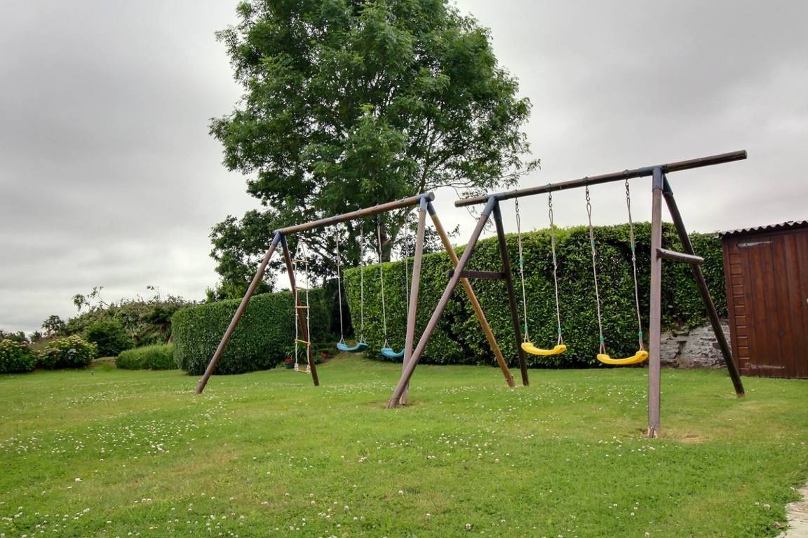 Haus, das an zwei weitere Gîtes grenzt, auf einem Anwesen mit insgesamt 5 Gîtes. EG: Wohnraum mit Kaminofen. Küche. WC. 1.Stock: 2 Doppelzimmer, Einzelzimmer, sep. WC. E-Heizung. Gemeinsamer Garten, Gartenmöbel, Grill, Spielplatz, Schaukel.