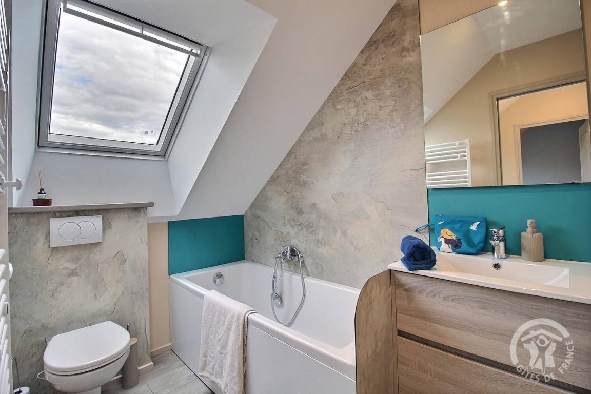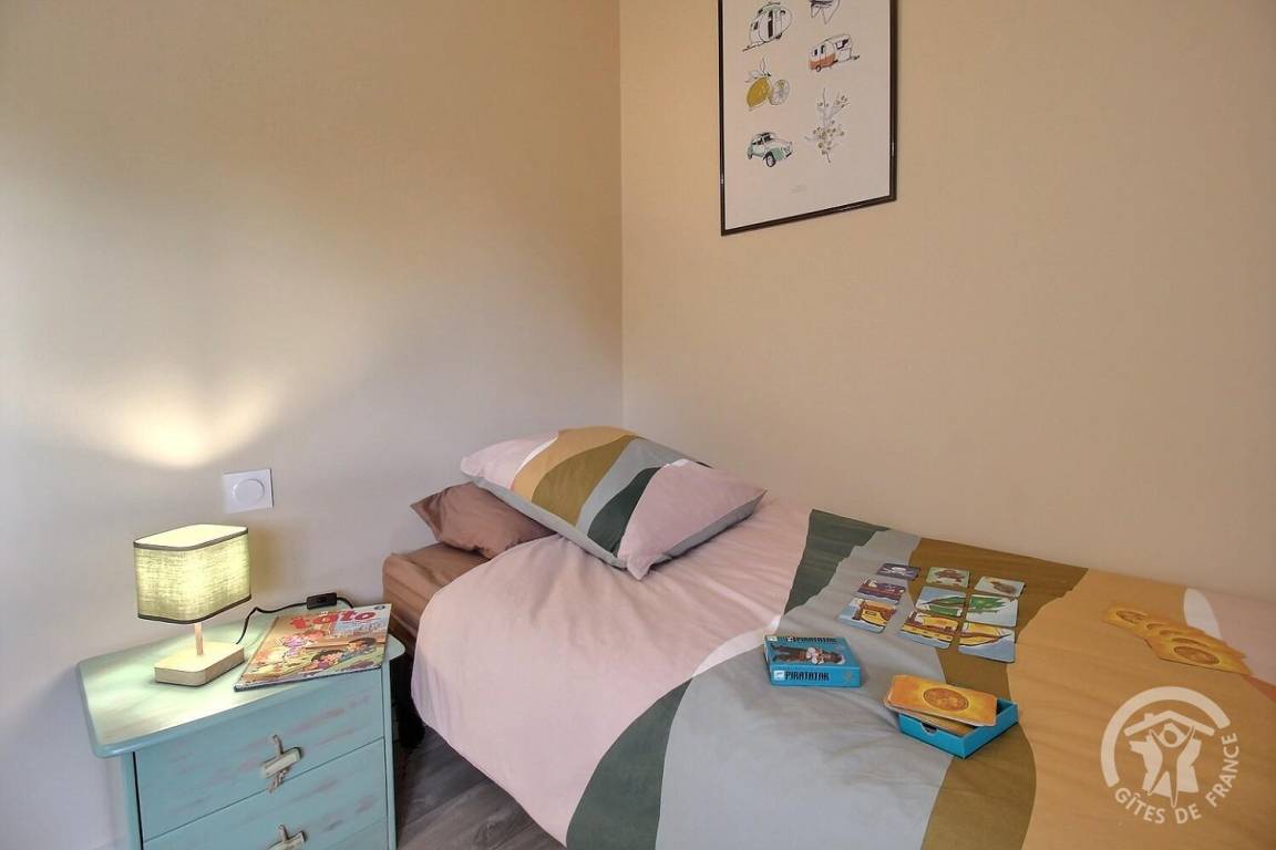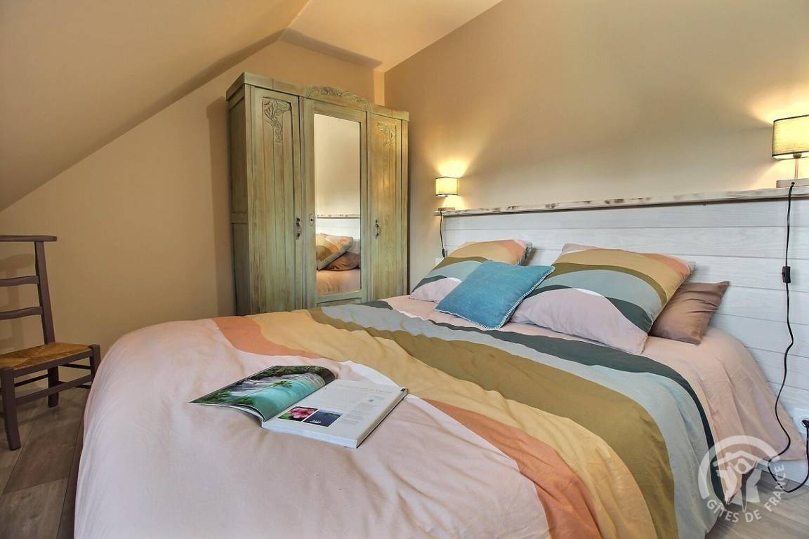 - Im Obergeschoss: ein Schlafzimmer (1 Bett 160x200 und 1 Bett 90x200), ein kleines Schlafzimmer (1 Bett 90x200), ein Badezimmer mit Badewanne und WC.