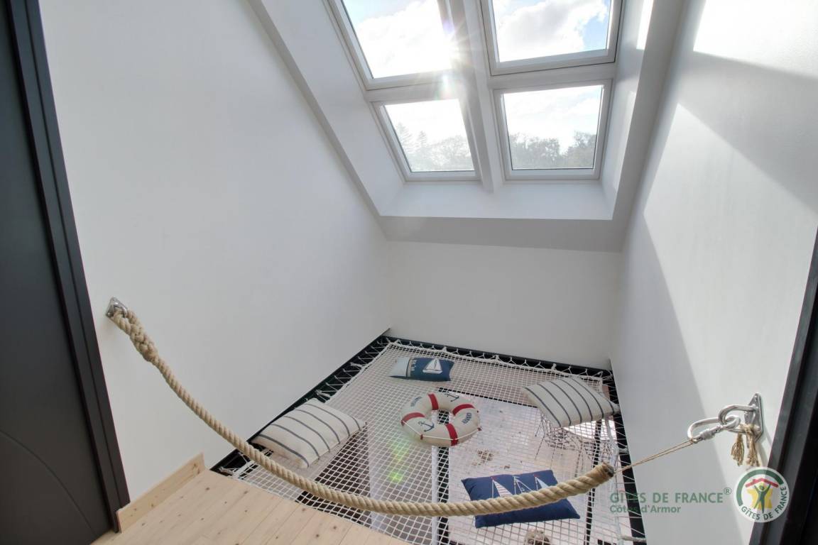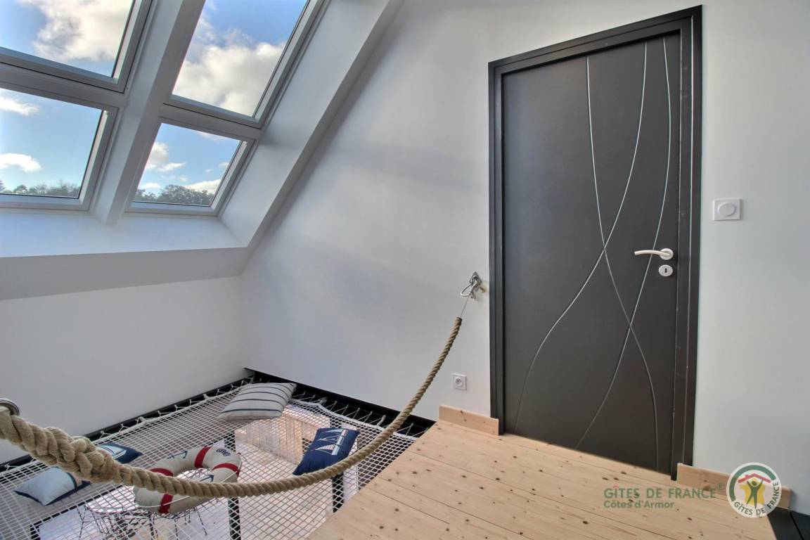 Ihre Ferienwohnung umfasst im Erdgeschoss (über 5 Stufen erreichbar): Küche mit Essbereich, Wohnzimmer, Bad mit Dusche, WC. Obergeschoss: 2 Schlafzimmer (1 Doppelbett 160x200, 2 Einzelbetten 90x190), ein über der Küche aufgehängtes internes Netz bietet Ihnen einen zusätzlichen Entspannungsbereich für Jung und Alt: was für ein Glück! Zu Ihrer Verfügung: zwei Terrassen (eine von 9 m², die andere von 20 m²), ein Garten von 1600 m² mit Blick auf Pferde, privat. Parken für Ihre Fahrzeuge im privaten Innenhof der Gîte (170 m²).