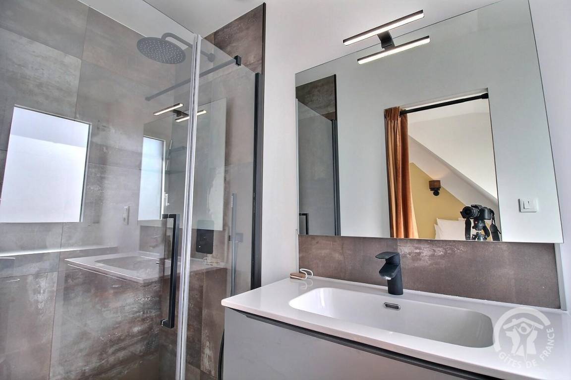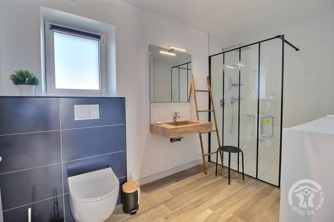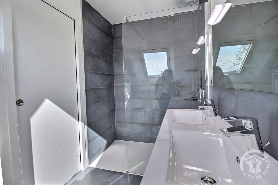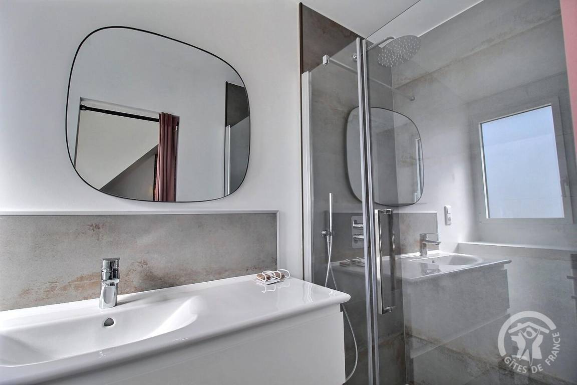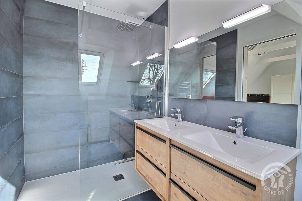 - Obergeschoss: ein Schlafzimmer (1 Bett 180x200) mit Zugang zu einem privaten Badezimmer mit Dusche, ein zweites Schlafzimmer (2 Betten 80x200) mit Zugang zu einem Badezimmer mit Dusche, ein drittes Schlafzimmer (4 Betten 80x200) mit Zugang zu einem privaten Badezimmer mit Dusche, eine separate Toilette.