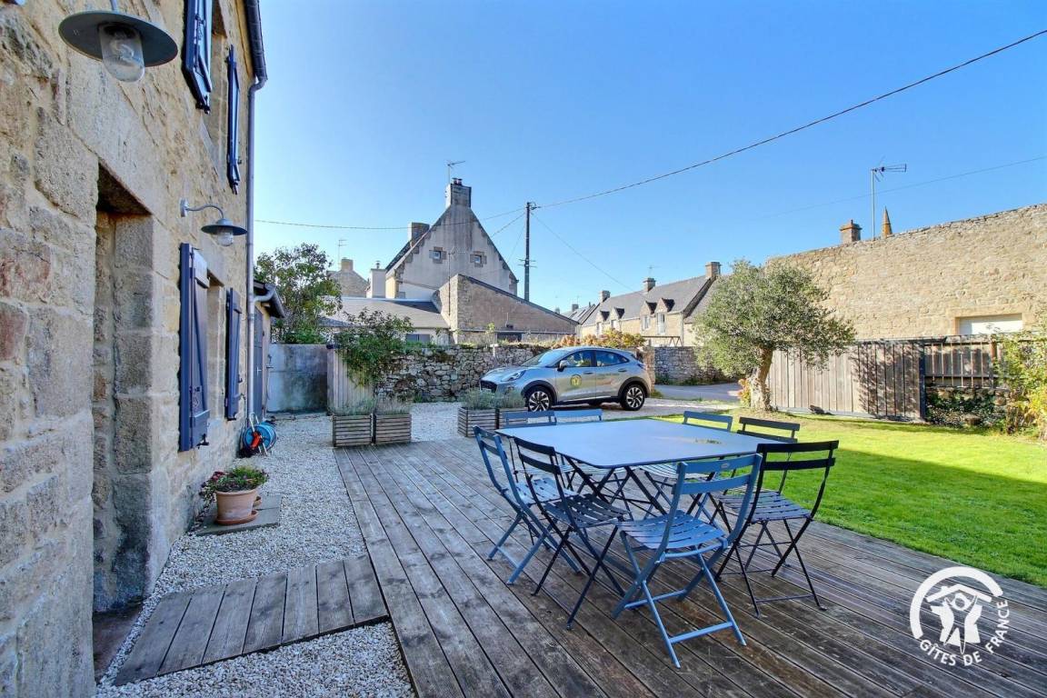 150 m² großer, umzäunter Garten und möblierte Terrasse mit Tisch, Stühlen, Liegestühlen und Grill