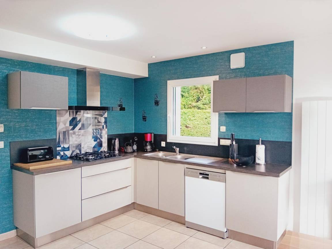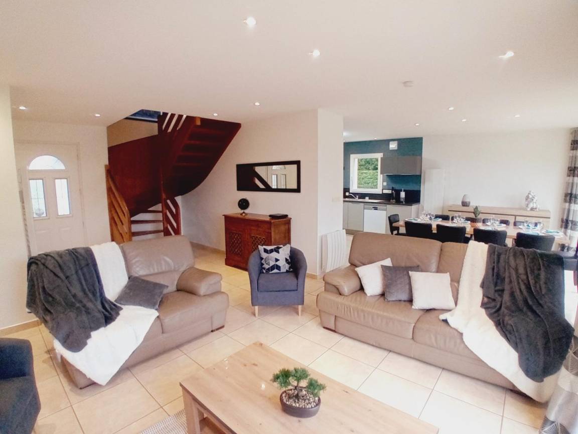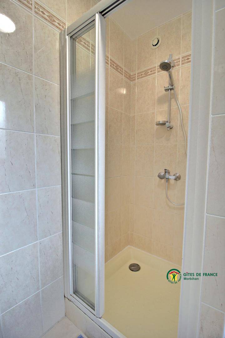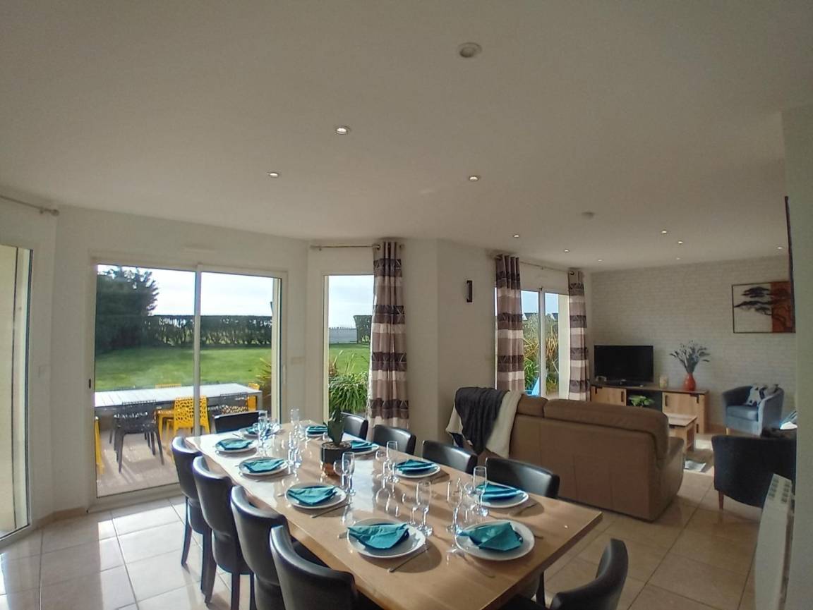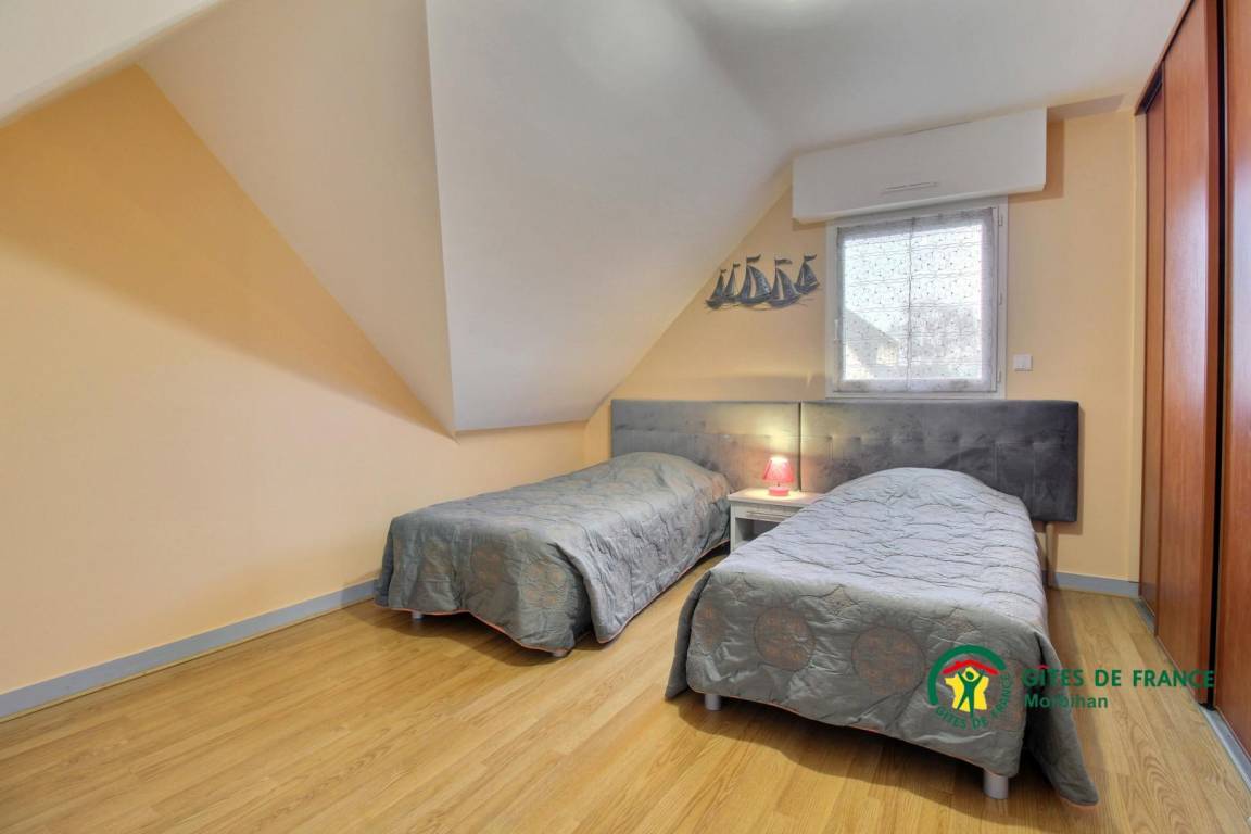 Detached gite 0.8 km from Plouhinec, along the road leading to the beaches. Living room/kitchen corner/sitting area (DVD, video player), mezzanine, 4 bedrooms (2 double beds - 1 is 160x200 -, 4 single beds, 1 child bed), shower room, bathroom, 2 wcs, electric heating. Garage, Garden 2000m², terrace, garden furniture, BBQ. Internet access. Modern house with an overview on the ocean from upstairs and a cosy interior, near sandy beaches .