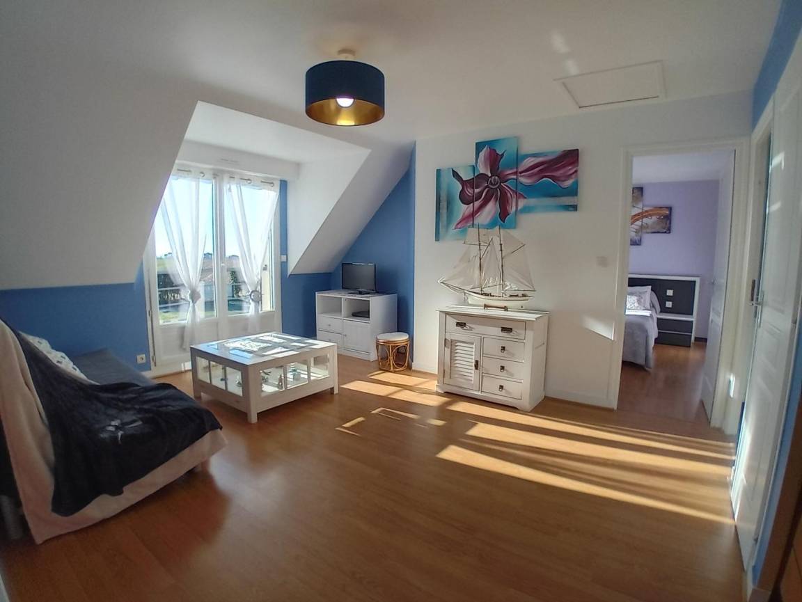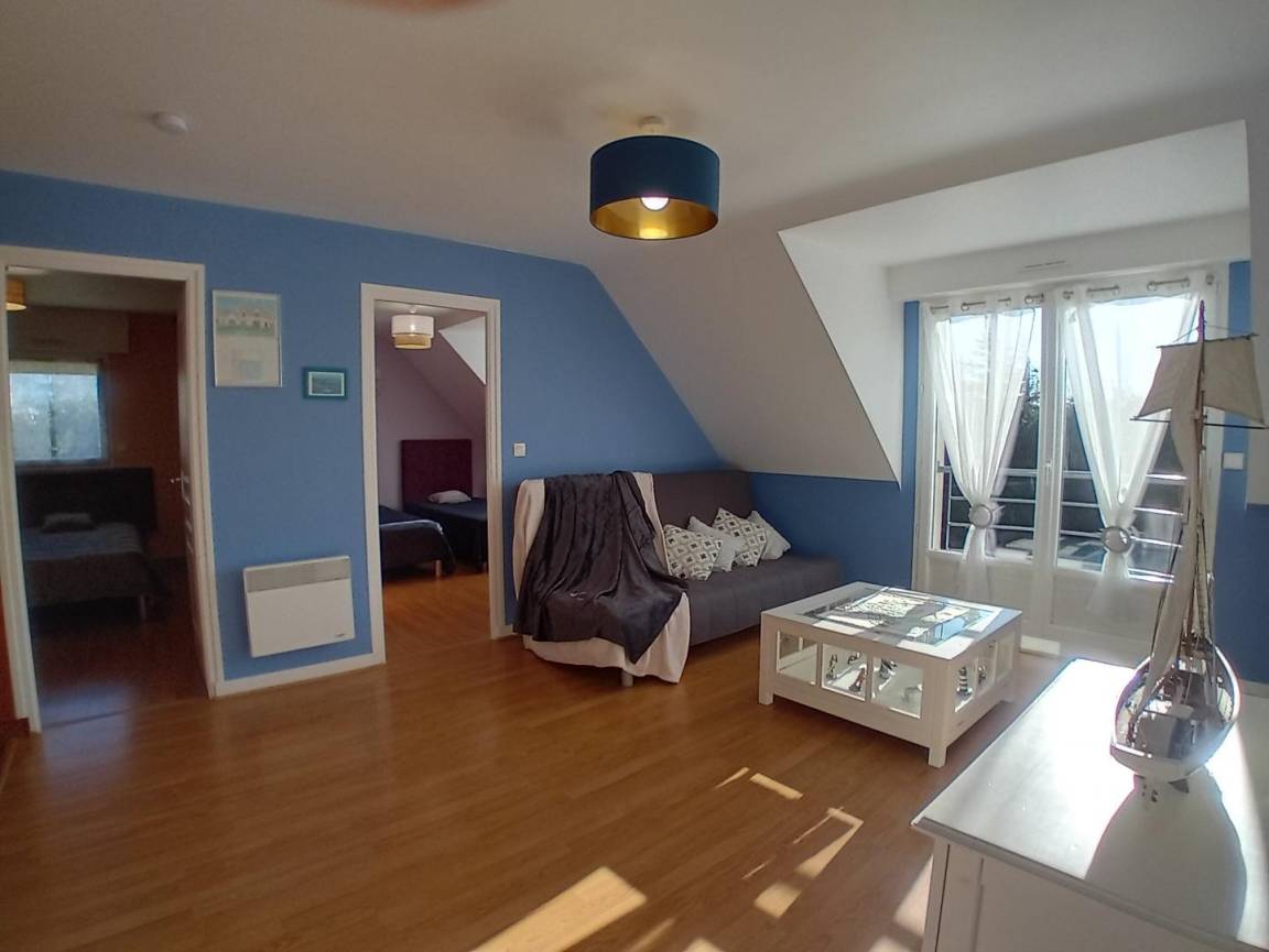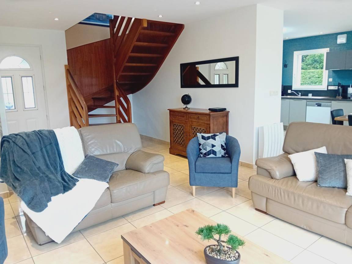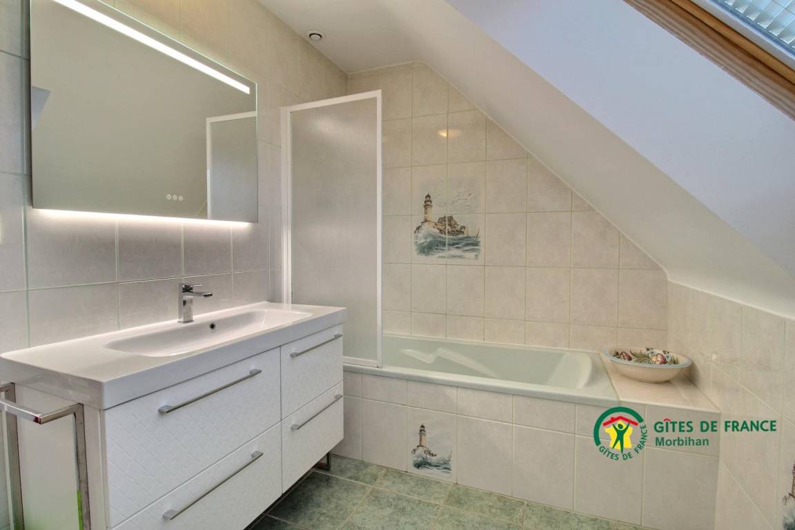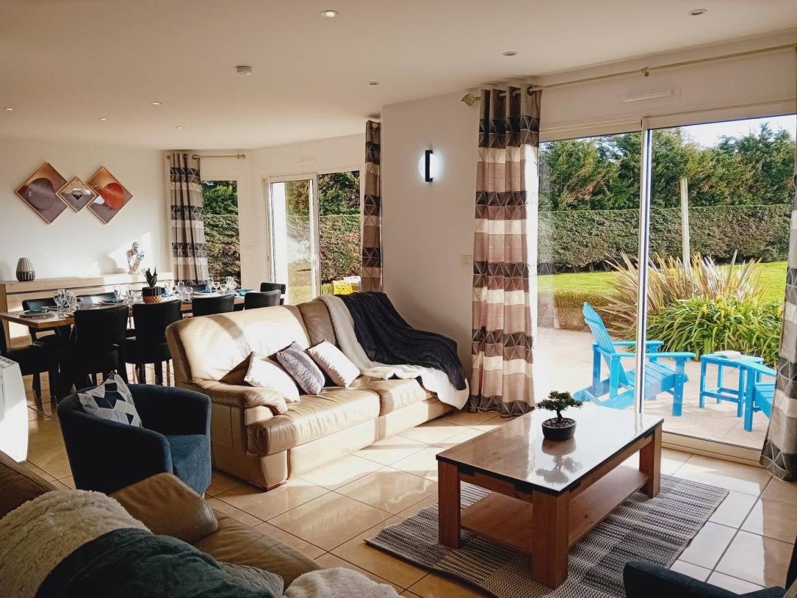 Detached gite 0.8 km from Plouhinec, along the road leading to the beaches. Living room/kitchen corner/sitting area (DVD, video player), mezzanine, 4 bedrooms (2 double beds - 1 is 160x200 -, 4 single beds, 1 child bed), shower room, bathroom, 2 wcs, electric heating. Garage, Garden 2000m², terrace, garden furniture, BBQ. Internet access. Modern house with an overview on the ocean from upstairs and a cosy interior, near sandy beaches .