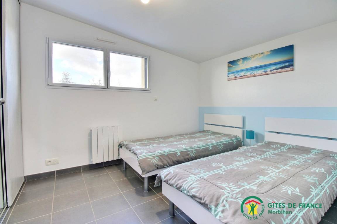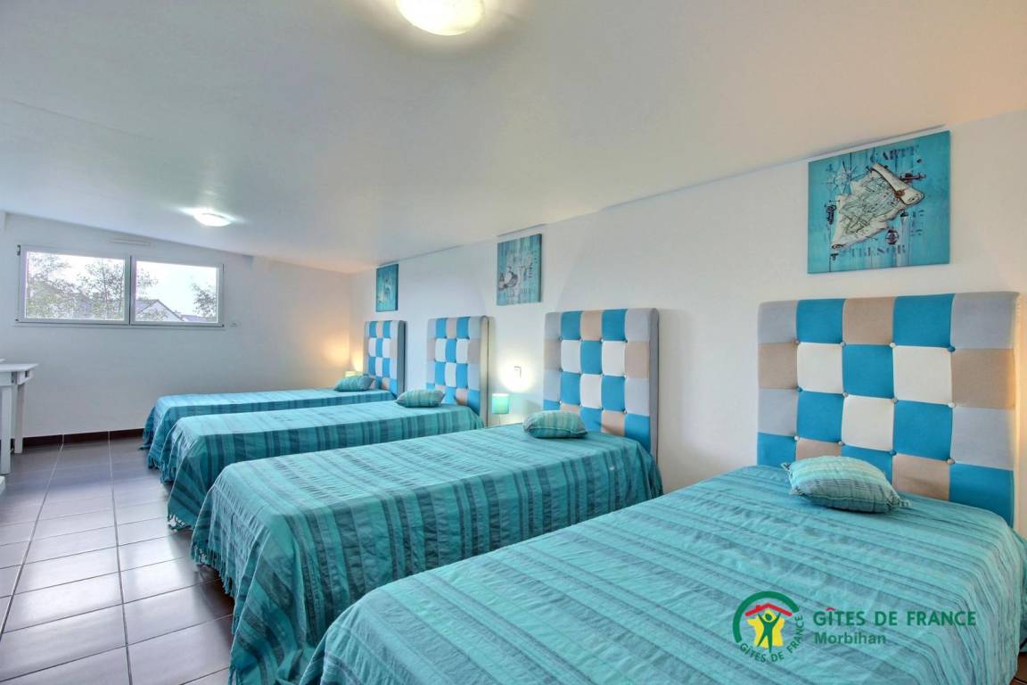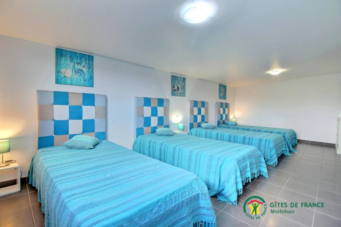 - Obergeschoss: 2 Schlafzimmer mit 1 Bett 160 x 200, 1 Schlafzimmer mit 2 Betten 90 x 190, 1 Schlafzimmer mit 4 Betten 90 x 190, ein Badezimmer und eine separate Toilette.