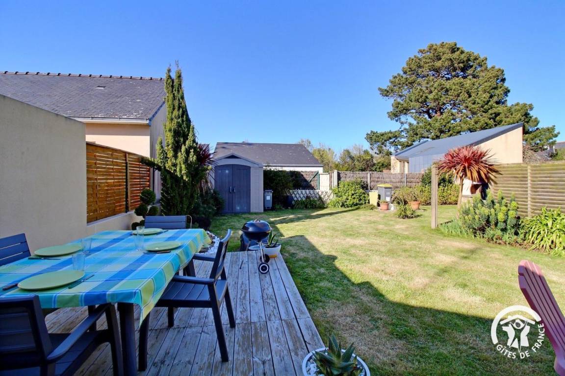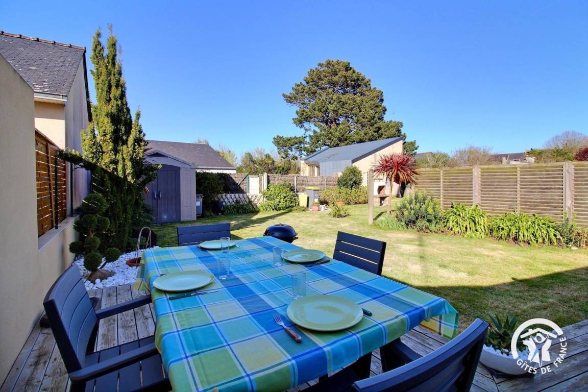 Terrasse und Garten mit Tisch und Stühlen, Gartenmöbeln, Grill und Sonnenschirm
