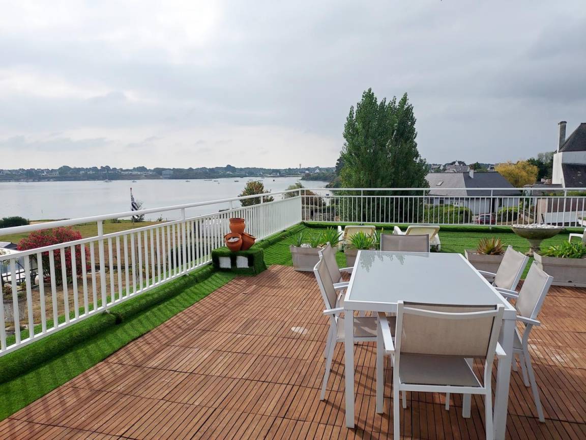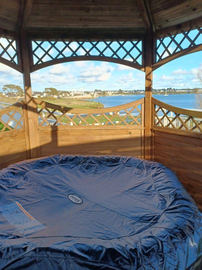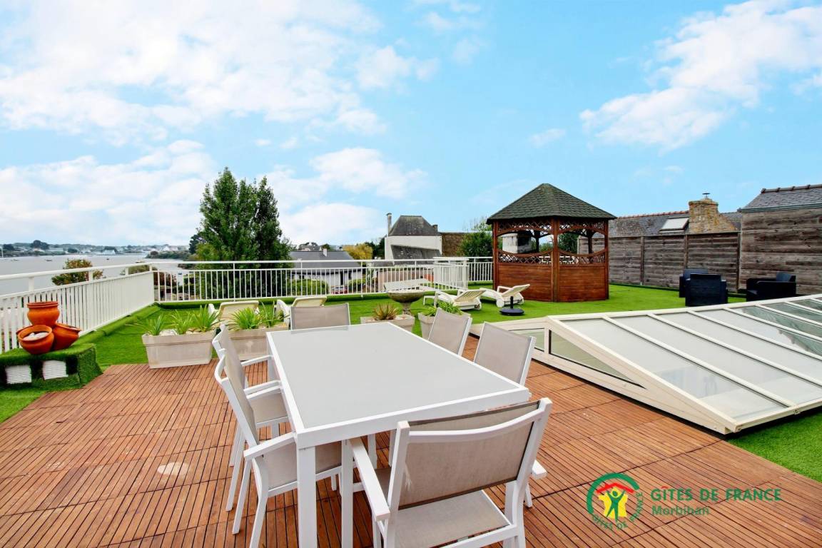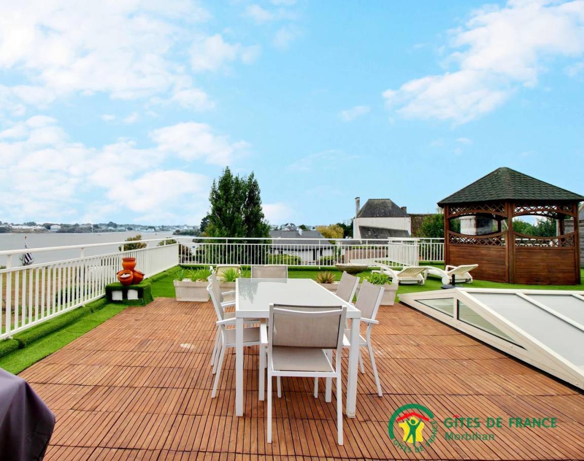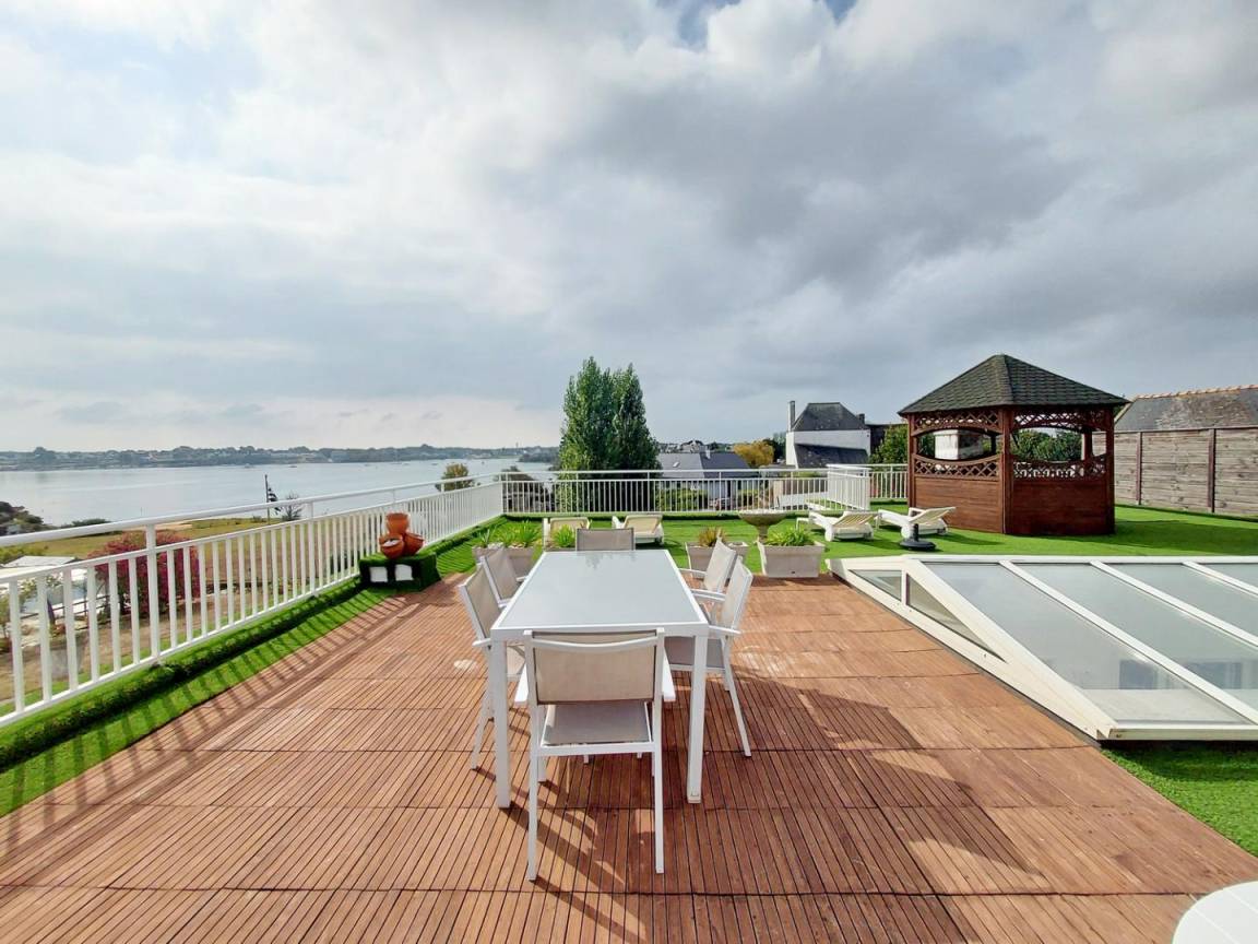 - eine große Terrasse von 150 m² mit herrlichem Blick auf den Fluss Etel, ausgestattet mit Gartenmöbeln, Liegestühlen, Gasgrill und einem aufblasbaren Whirlpool unter dem Kiosk.