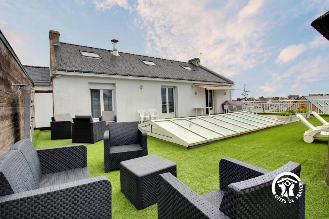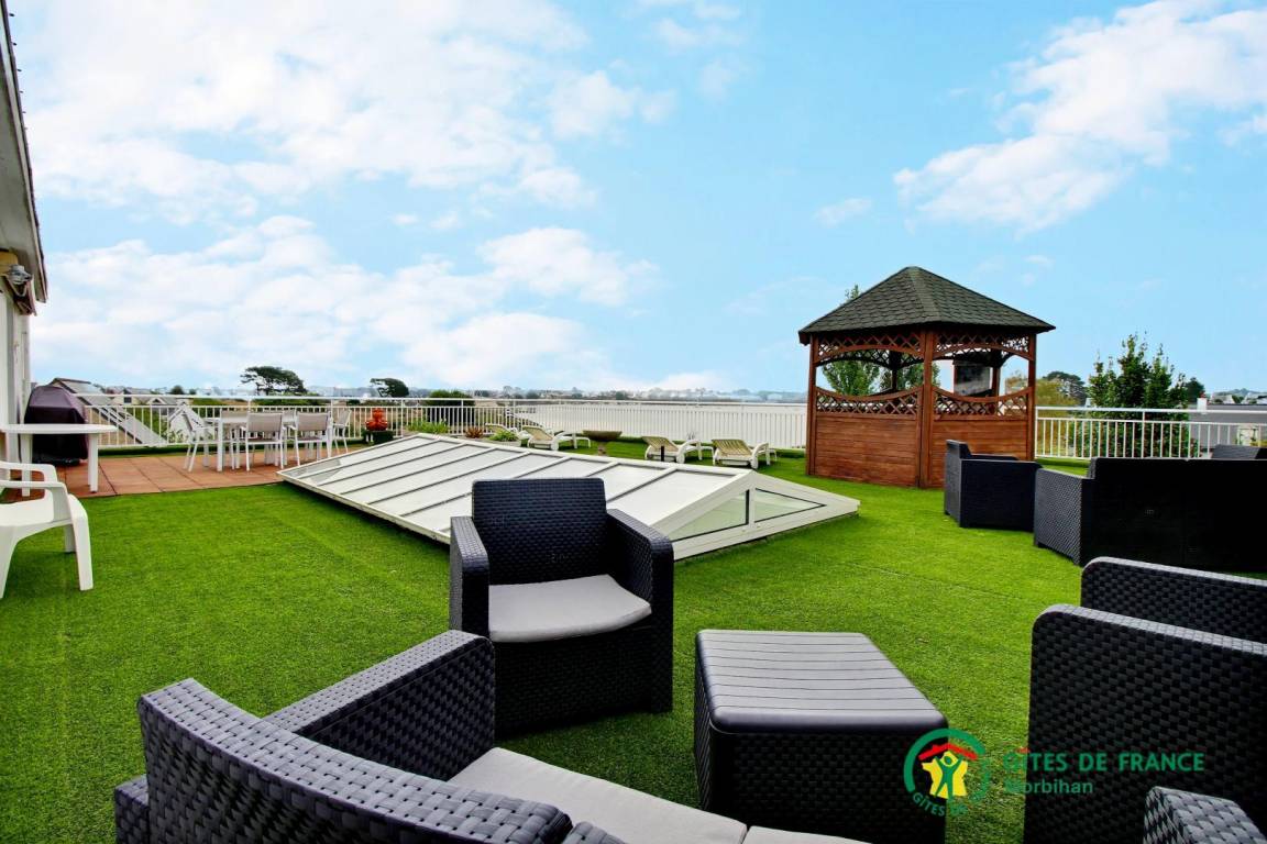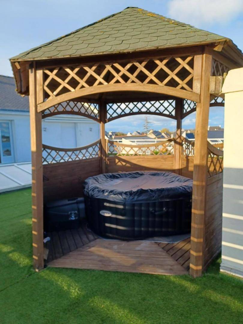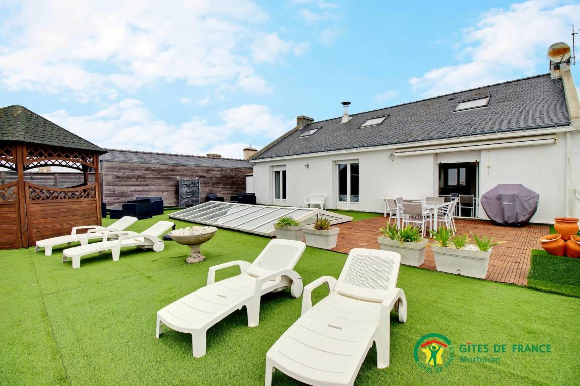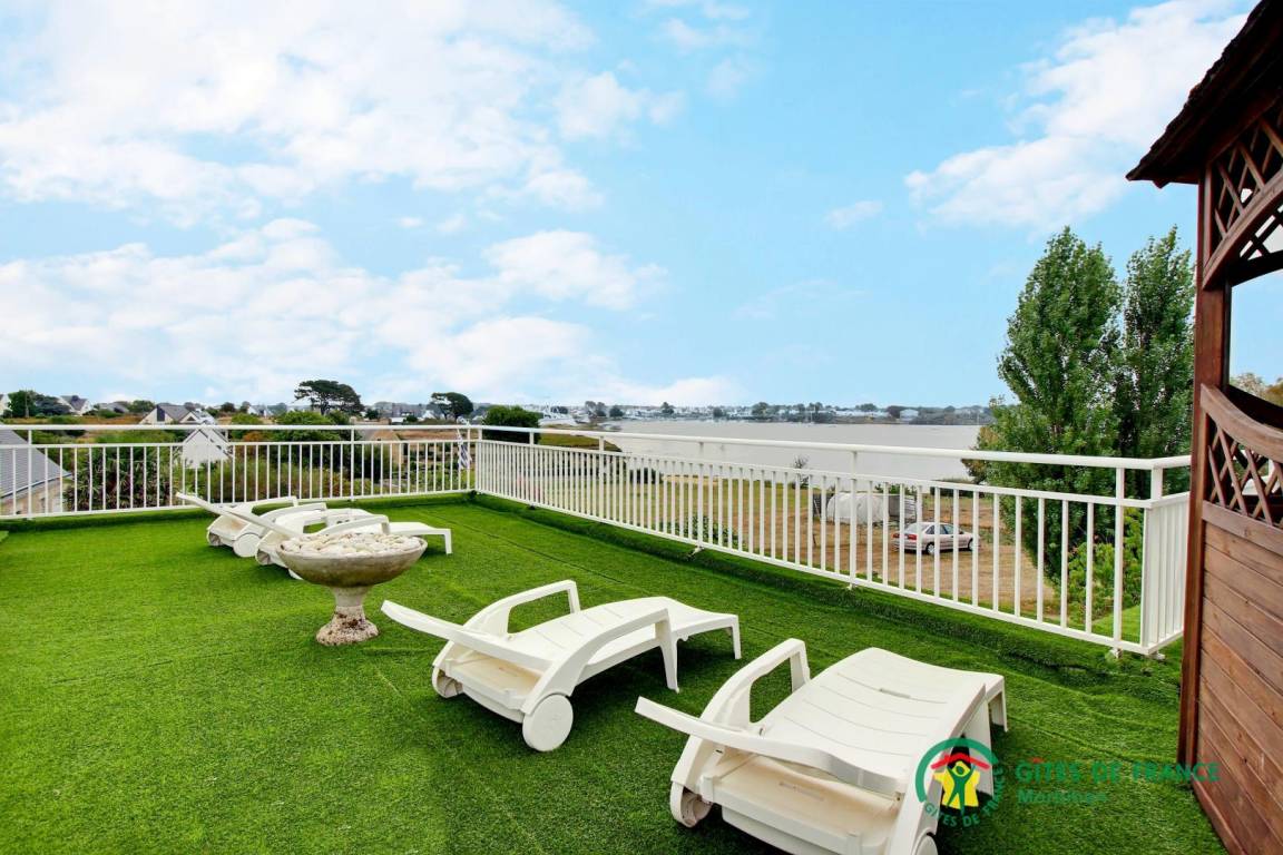 - eine große Terrasse von 150 m² mit herrlichem Blick auf den Fluss Etel, ausgestattet mit Gartenmöbeln, Liegestühlen, Gasgrill und einem aufblasbaren Whirlpool unter dem Kiosk.