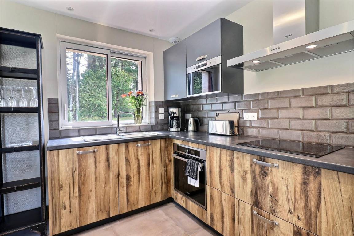 Draußen gibt es eine große Holzterrasse, einen Garten und einen privaten Parkplatz vor dem Ferienhaus
