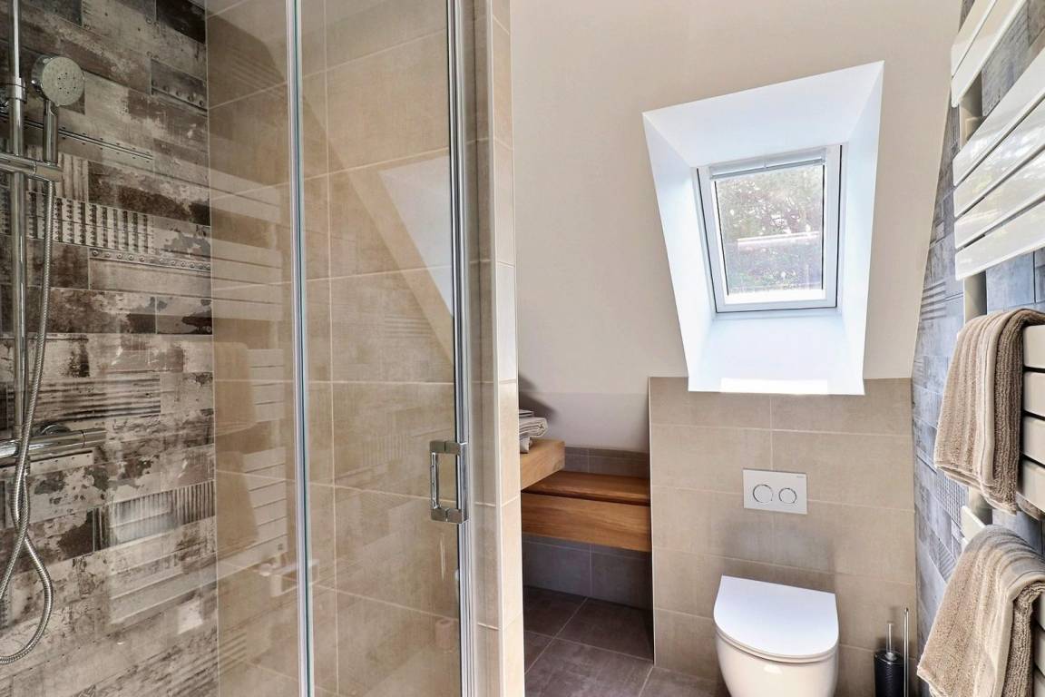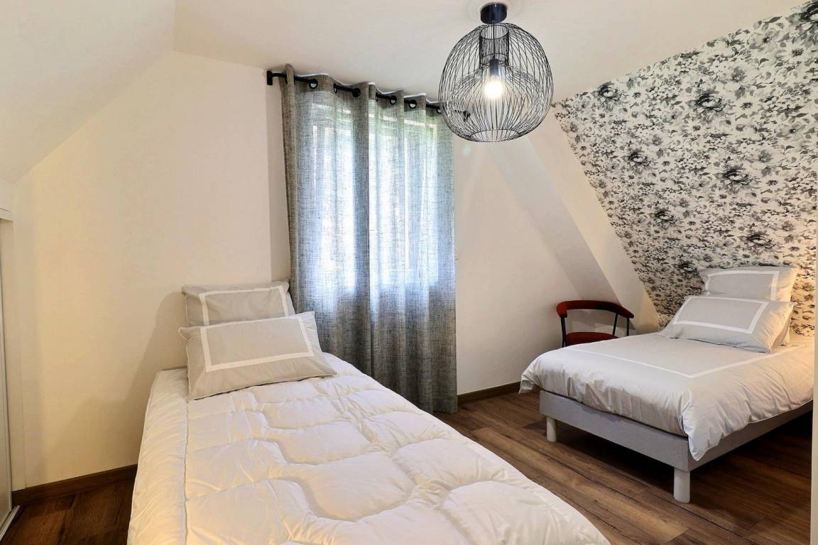 Obergeschoss: 2 Schlafzimmer (1 160-cm-Bett und 2 90-cm-Betten), ein Duschbad mit WC.