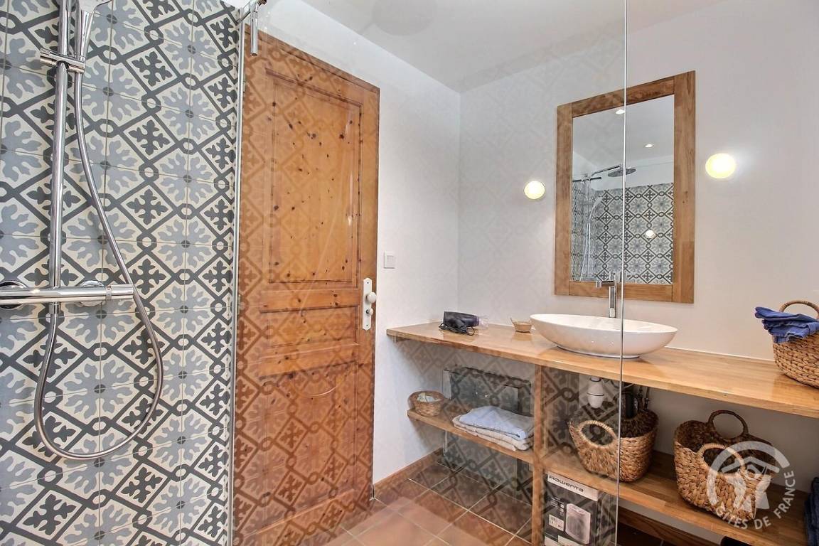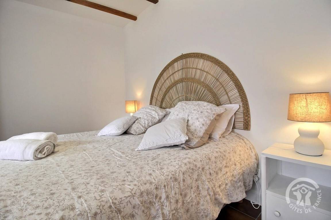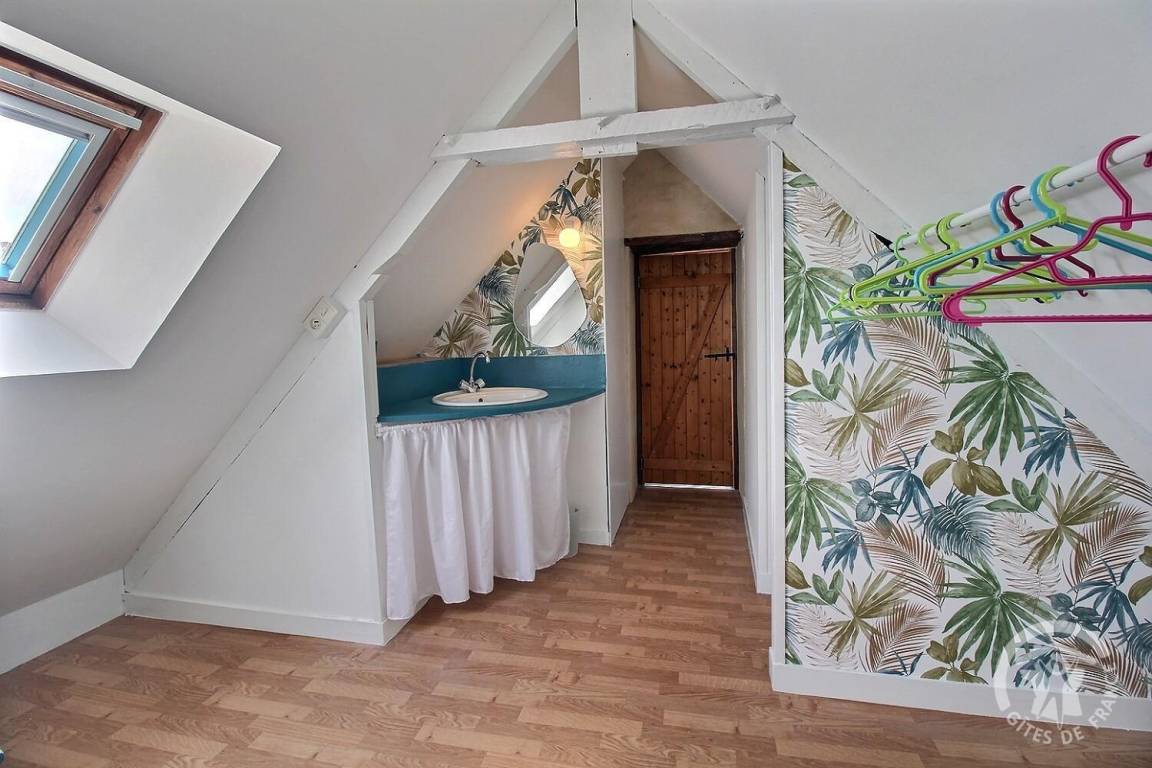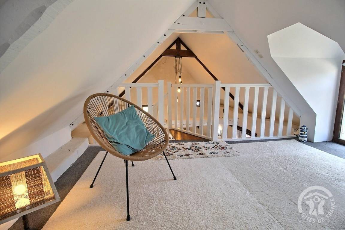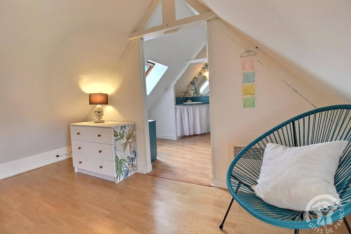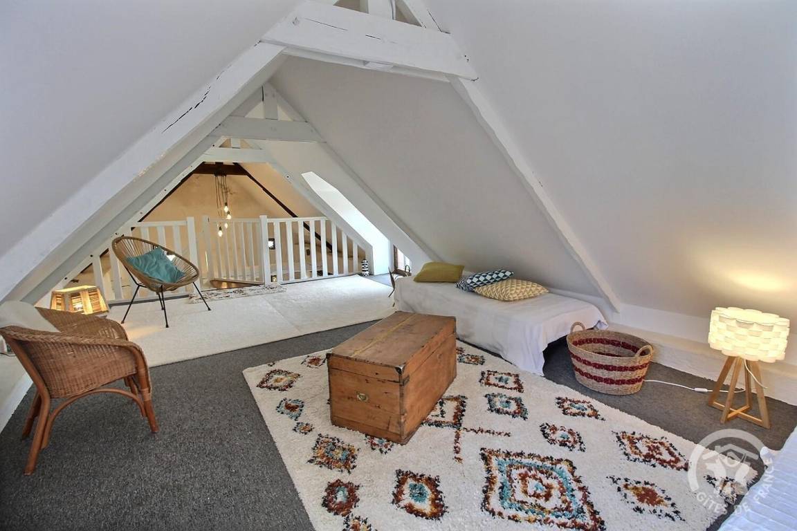 - Obergeschoss: ein Zwischengeschoss, ein Schlafzimmer unter dem Dach (2 Betten 80 x 200, die zu einem Bett 160 x 200 zusammengestellt werden können), das auf einen Toilettenbereich mit Waschbecken und einen sehr kleinen Toilettenbereich hinausgeht.