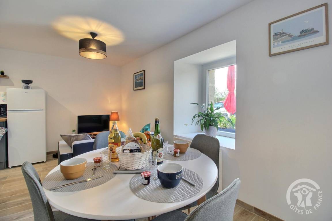 „Accueil très chaleureux des propriétaires, le petit plus le panier garni (palets bretons, confitures, cidre, jus de pommes, café, thé) à notre arrivée très appréciable. Nous avons eu le plaisir d'être les 1er locataires. Le gîte est très bien, décoré avec goût, propre et bien conçu pour 4 personnes et tout y est pour passer un agréable séjour !“