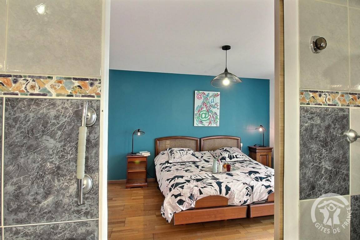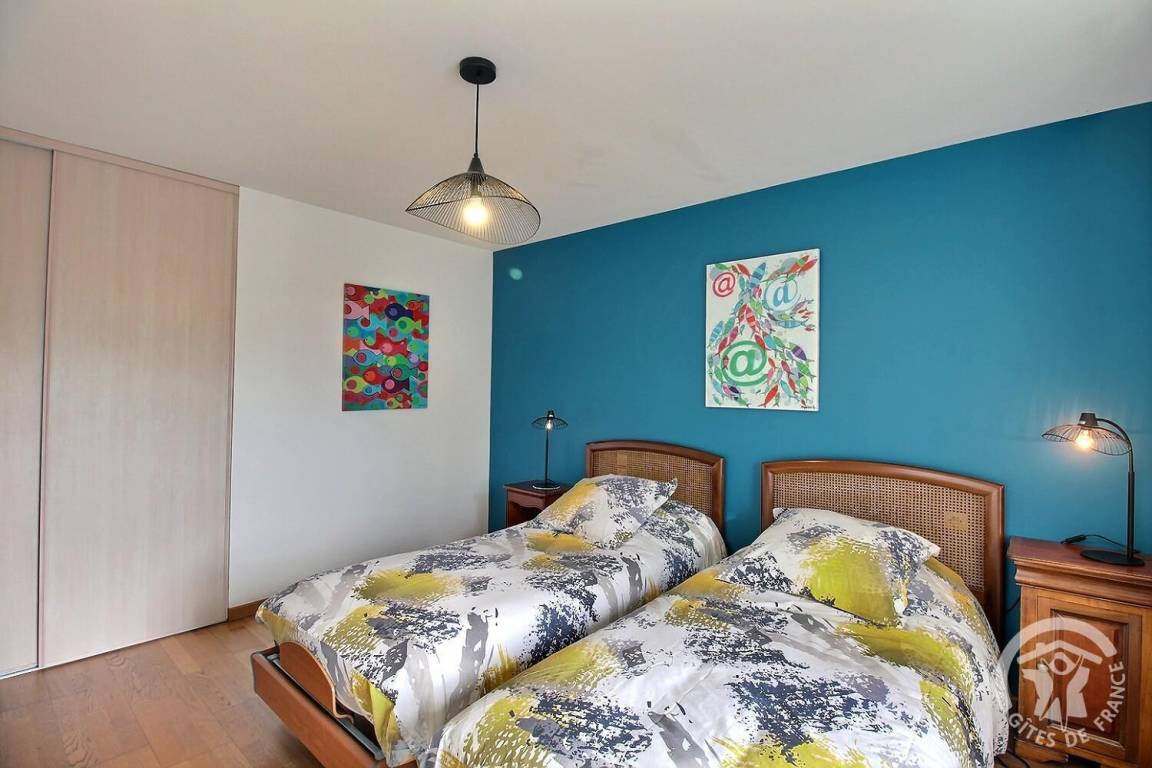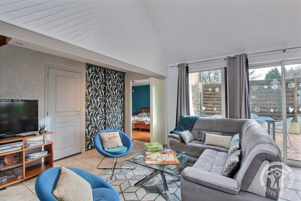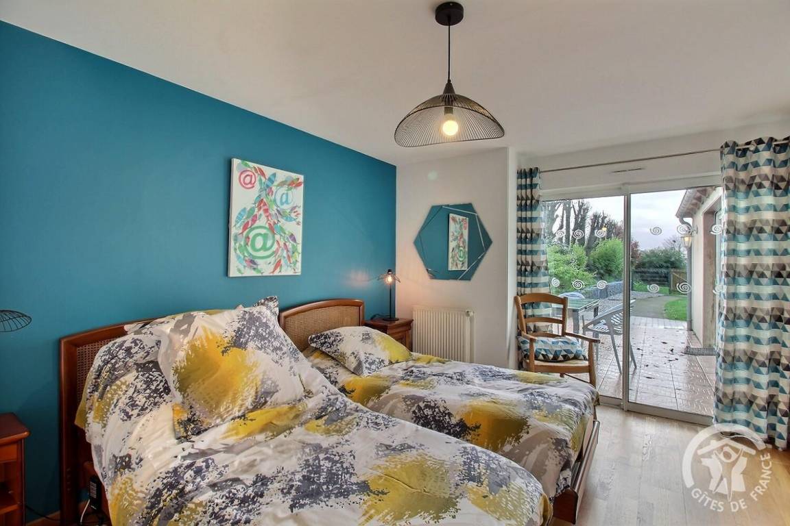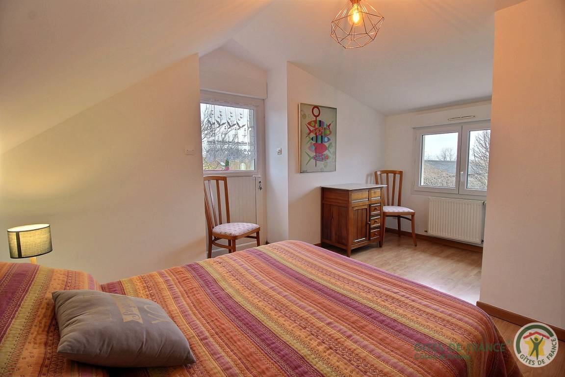 Ihre tourismus- und behindertengerechte Ferienwohnung umfasst im Erdgeschoss: Wohnzimmer mit Einbauküche, WC, Waschküche. 1 geräumiges Schlafzimmer (1 Bett 160 x 200) mit eigenem Badezimmer mit Dusche und Toilette. Etage: 2 angrenzende Schlafzimmer. Das erste enthält 2 Einzelbetten 90x190, es bietet Zugang zum Badezimmer mit Badewanne, Waschbecken und Toilette sowie Zugang zum hinteren Schlafzimmer: 1 Doppelbett 140x190. Private geflieste Terrasse von 20 m² ohne Blick und privater Garten von 250 m². Separater Eingang zur Gîte über den Hinterhof oder die vordere Terrasse über eine asphaltierte Auffahrt. Spezifischer und zugänglicher Parkplatz für dieses Ferienhaus. Aber auch großer gemeinsamer Fahrzeugparkplatz für alle Unterkünfte des Standorts und geschlossen.