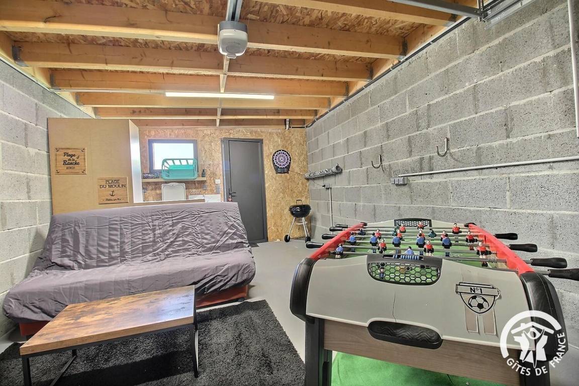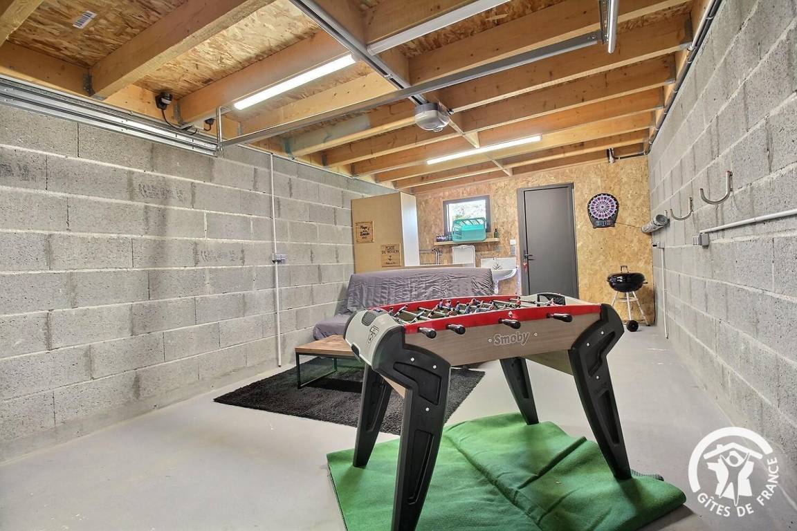 • Eine Garage mit Tischfußball, Dartscheibe und Waschmaschine