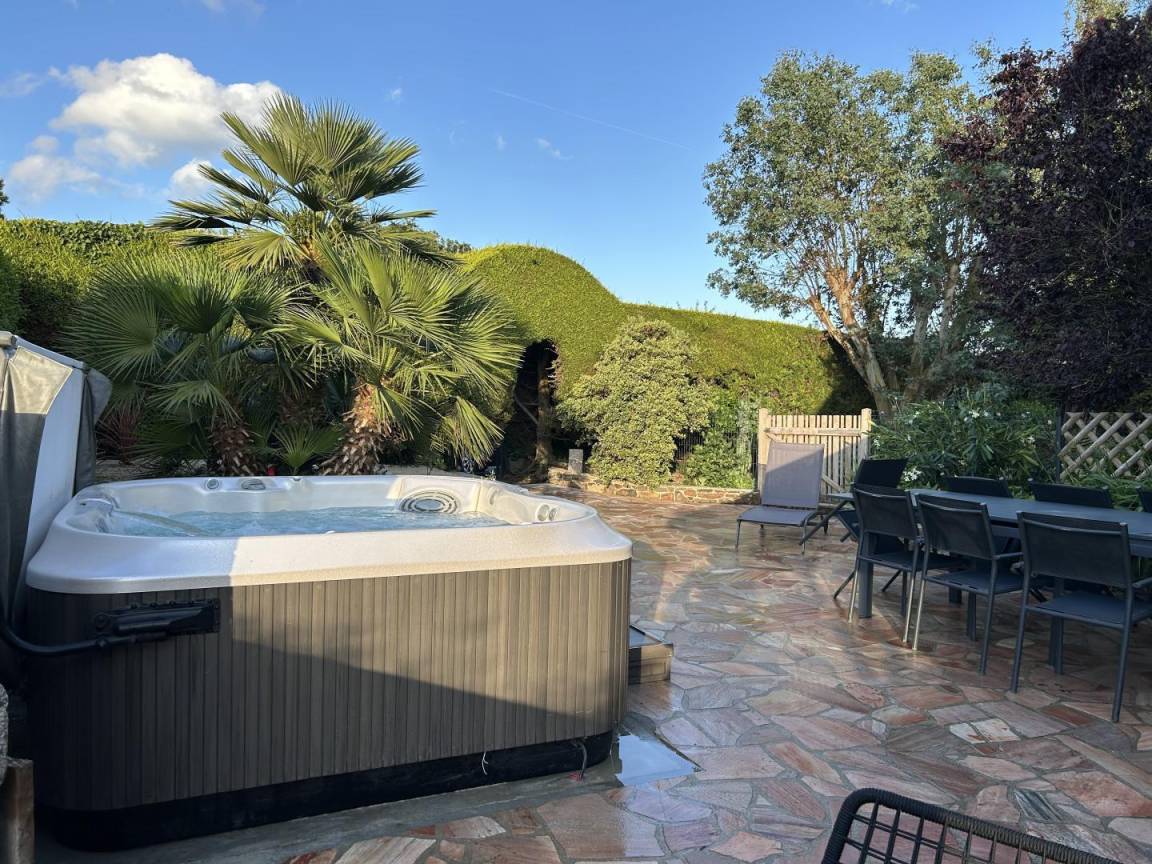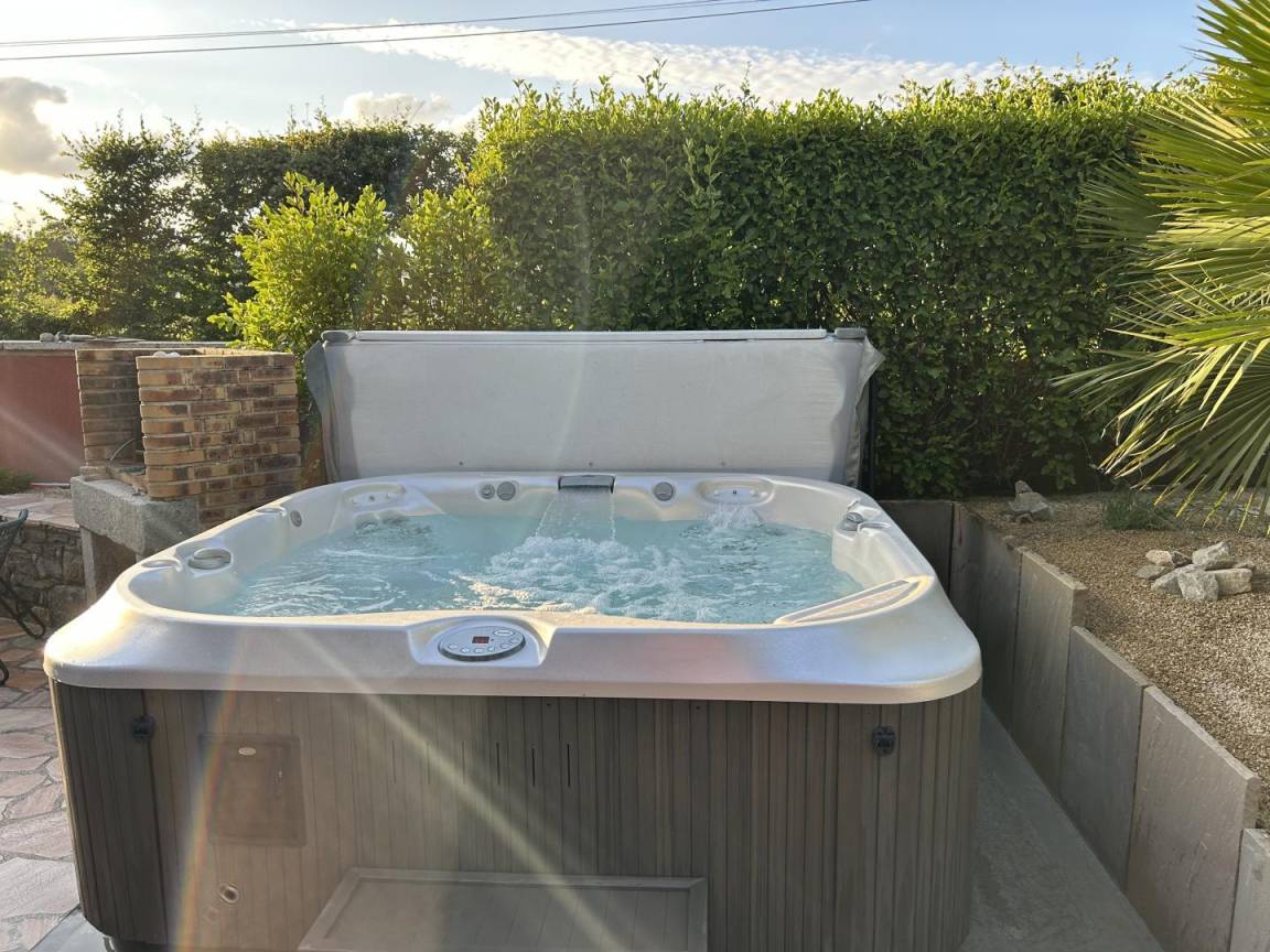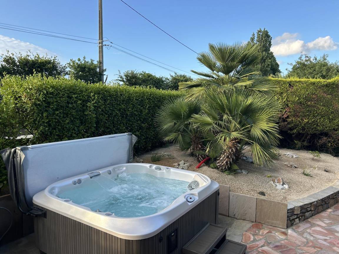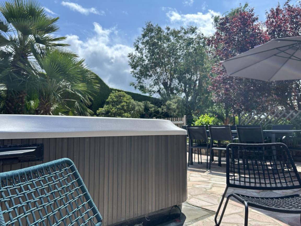 eine private, 40 m² große, angelegte, geschlossene Terrasse mit einem 5-Sitzer-Whirlpool (neu installiert im Juni 2025)