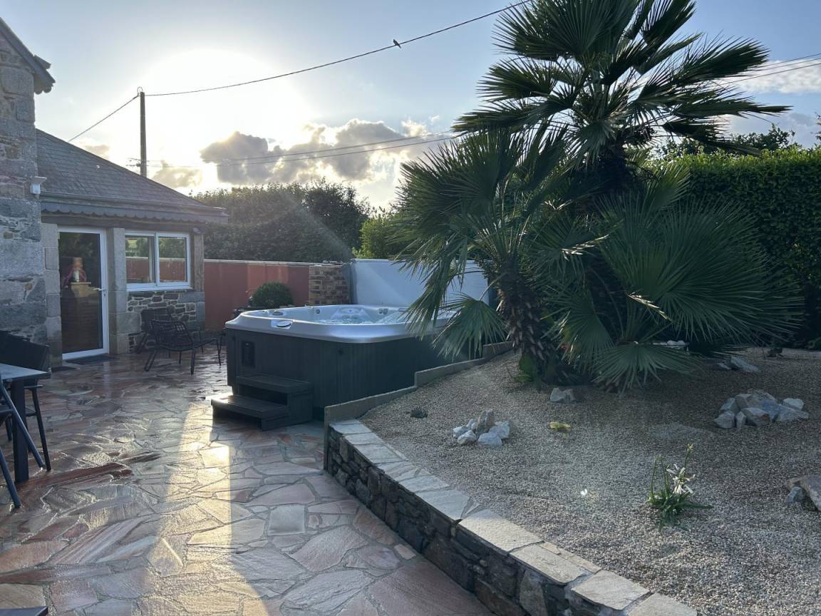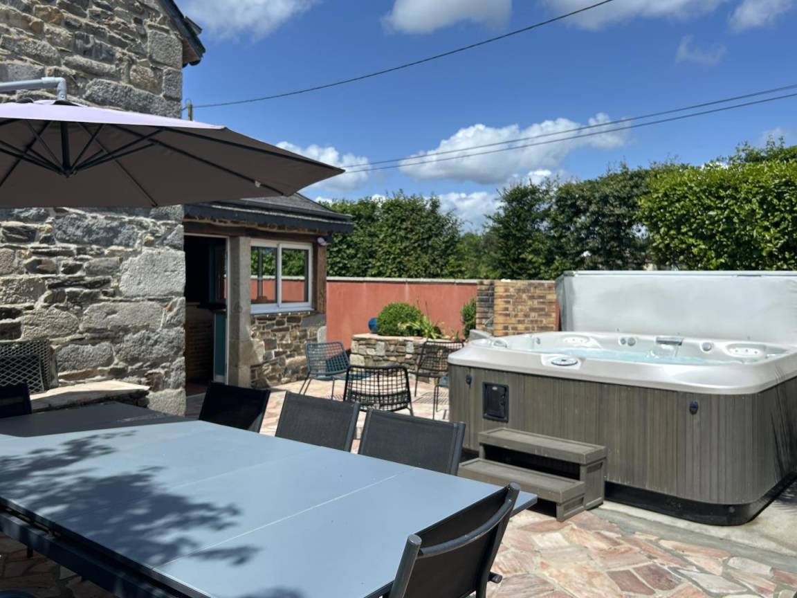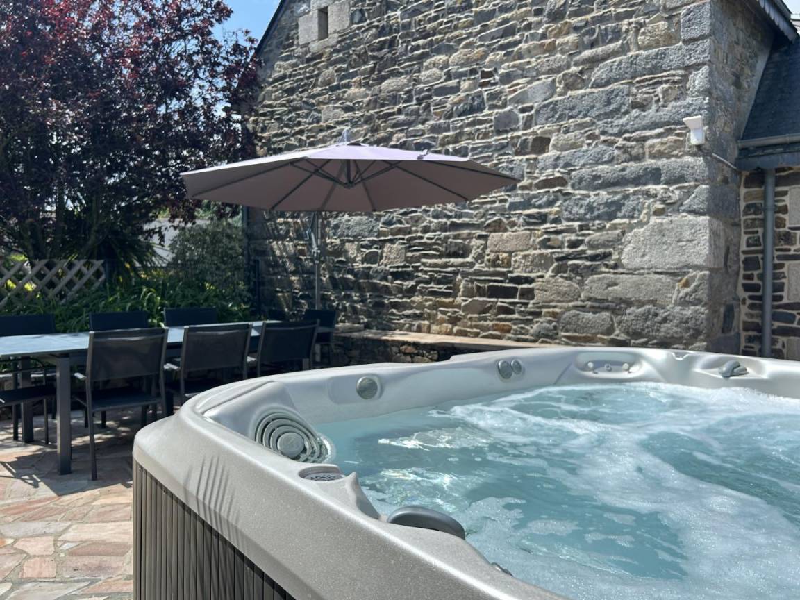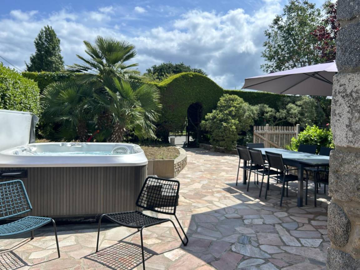 eine private, 40 m² große, angelegte, geschlossene Terrasse mit einem 5-Sitzer-Whirlpool (neu installiert im Juni 2025)