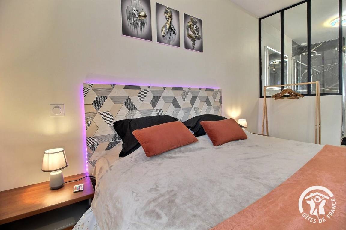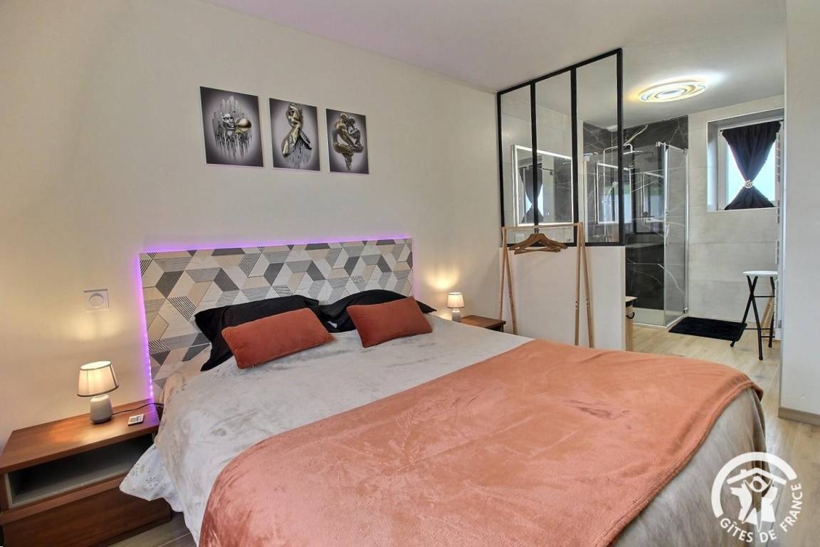 – Ein Schlafzimmer (1 Queensize-Bett) mit Zugang zum Badezimmer mit Dusche