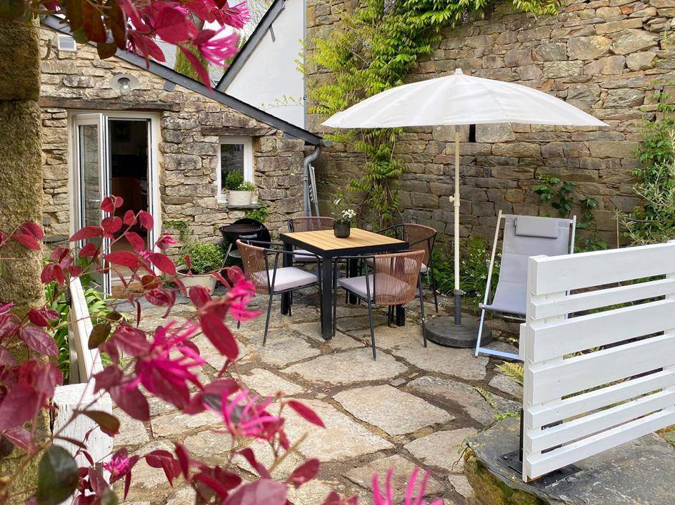 Sie genießen eine private Terrasse mit Gartenmöbeln und einem WEBER-Grill.