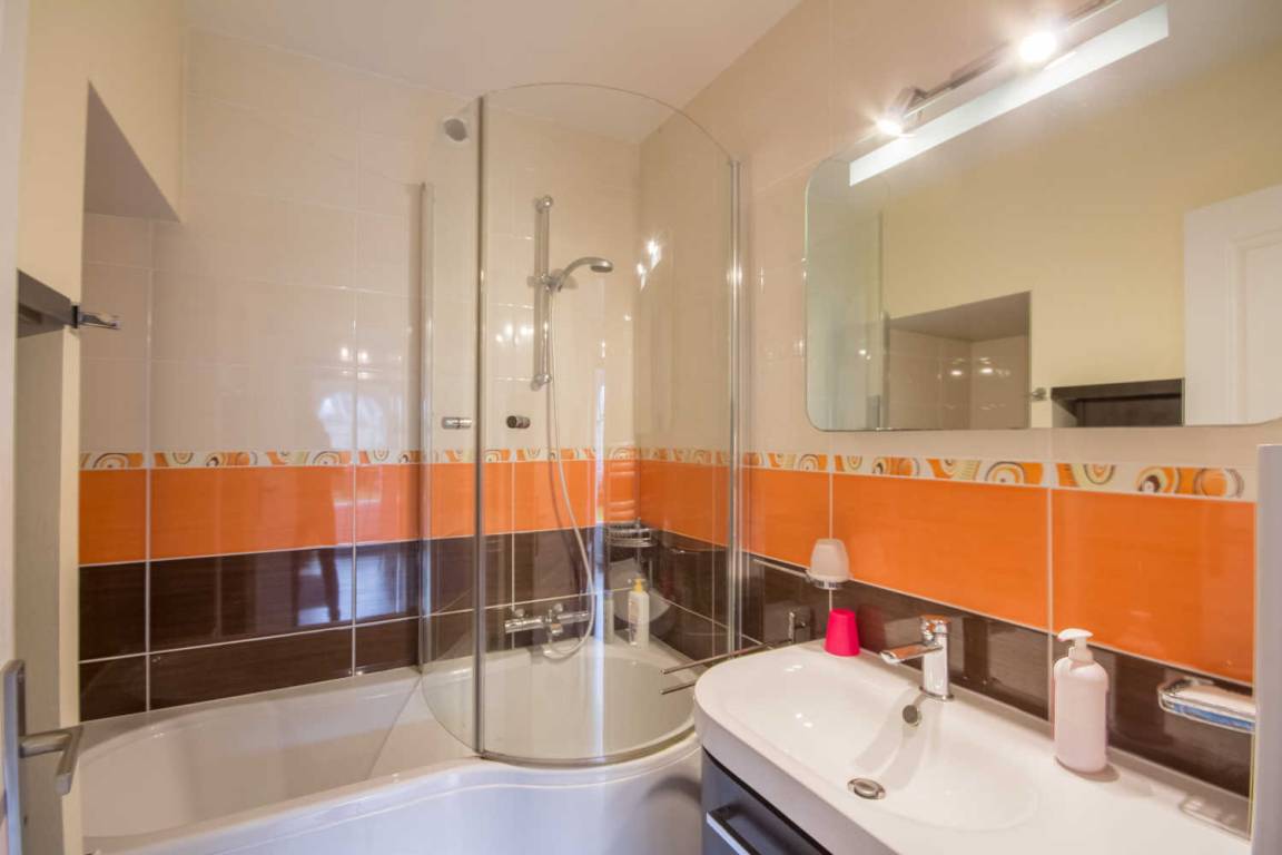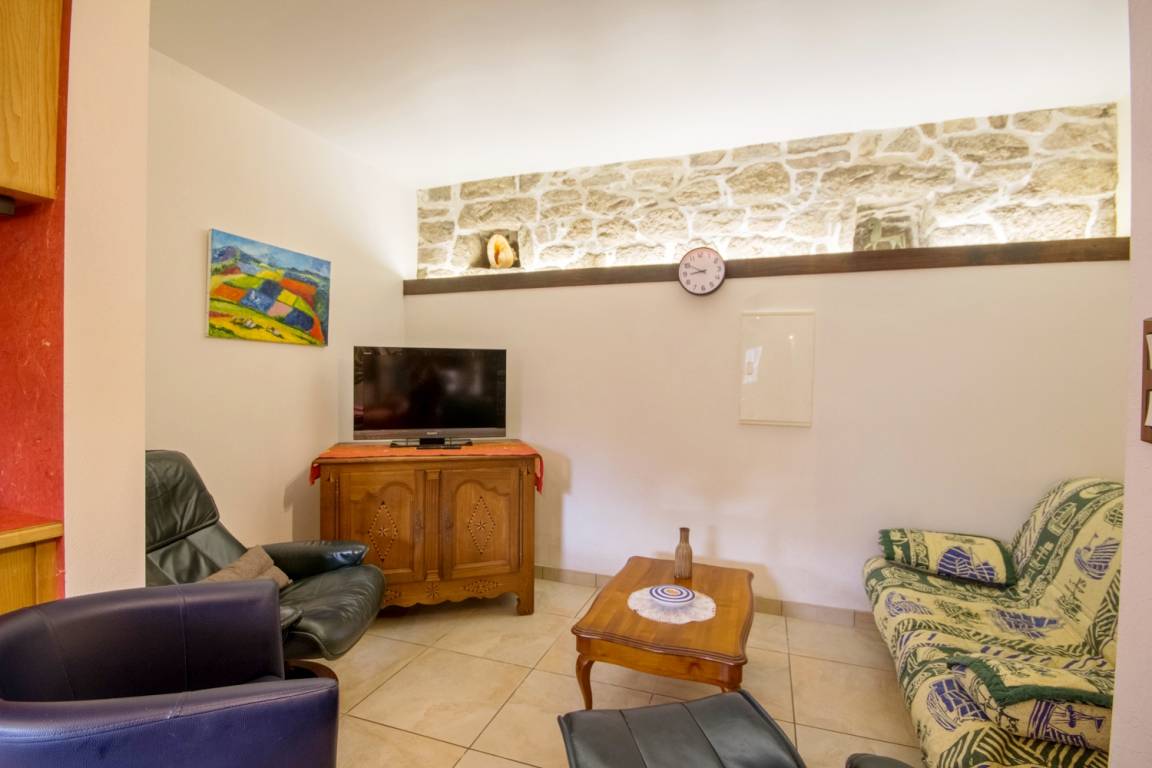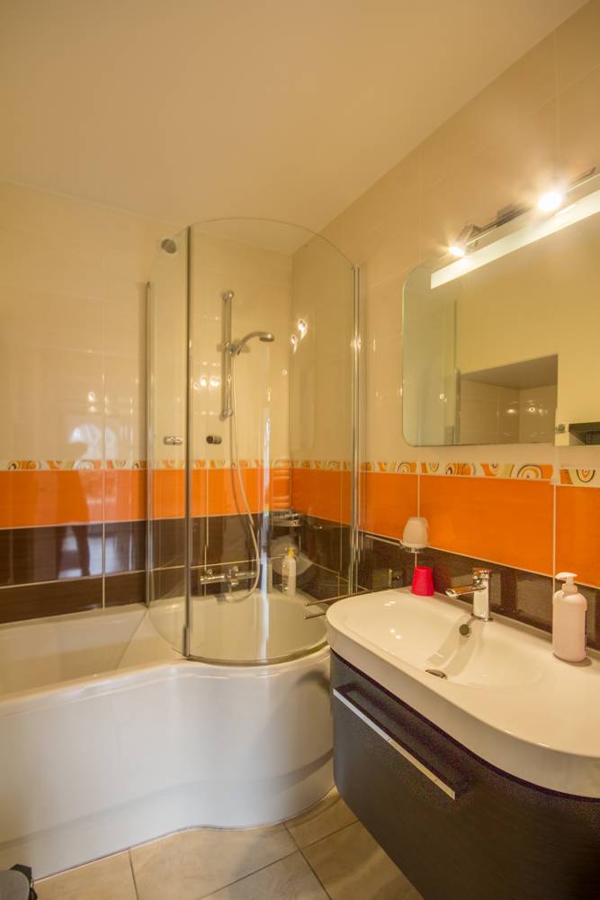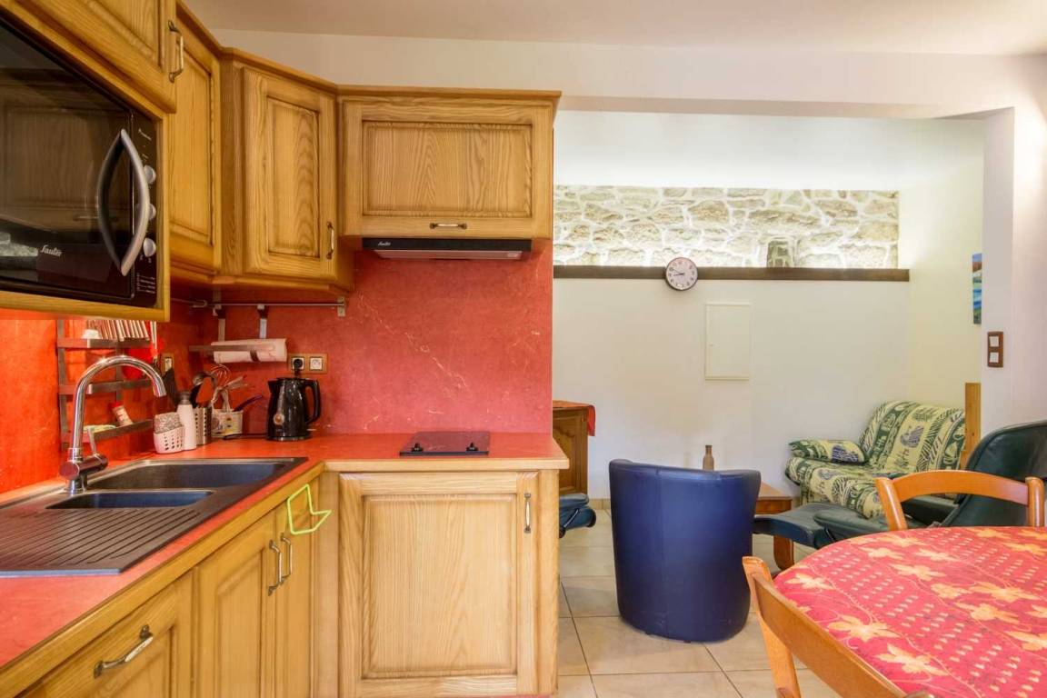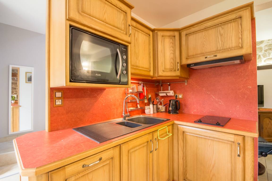 - Im Erdgeschoss: ein Wohnzimmer mit ausgestatteter Küche, ein Ess- und Wohnbereich in der Nische, ein Badezimmer mit Badewanne, Dusche und eine separate Toilette.