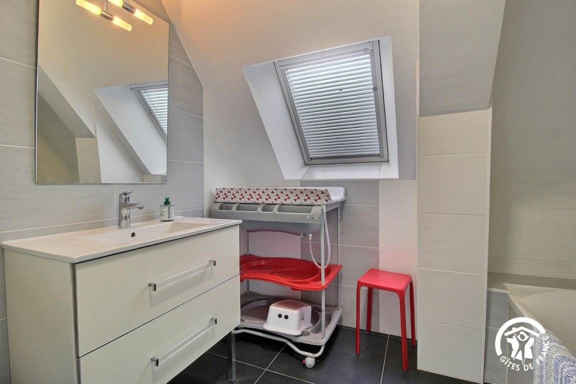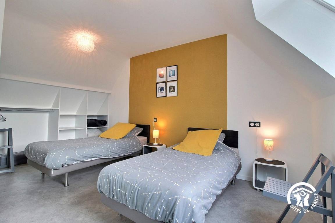 - Im Obergeschoss: zwei Schlafzimmer: eines mit einem Kingsize-Bett (180 x 190 cm), das in zwei Einzelbetten (90 cm) geteilt werden kann, und das andere mit zwei Einzelbetten (90 cm), ein Badezimmer mit Badewanne und ein separates WC.