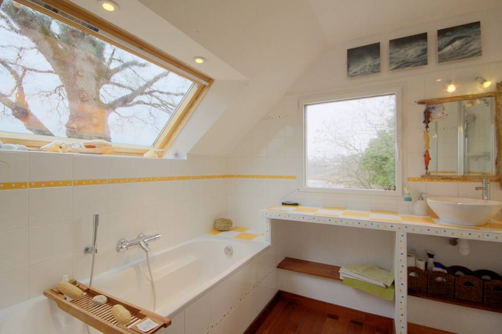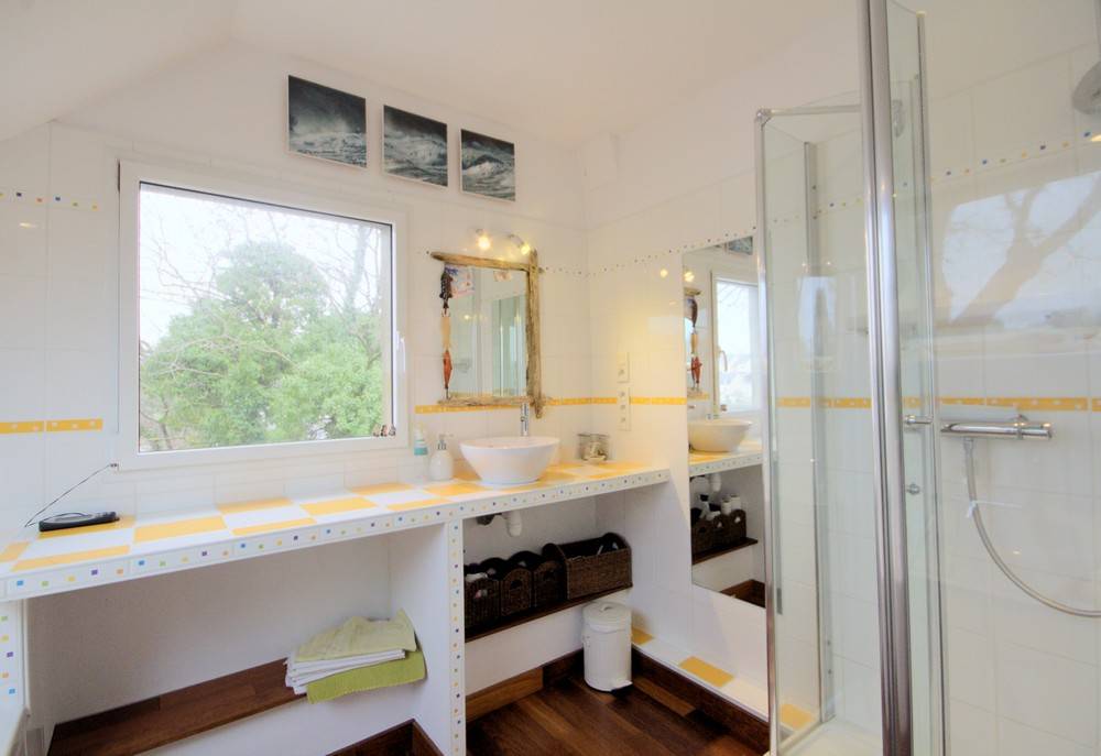 - Im Erdgeschoss: ein großer Wohnraum mit Einbauküche und Essbereich sowie ein großes Wohnzimmer, Toiletten, eine Waschküche, eine schöne Veranda, die als Wohnzimmer dient und auf eine angrenzende Terrasse führt, ein Garten mit direktem Zugang zum Fluss Auray und eine kleine Terrasse ohne vis-à-vis mit Blick auf den Fluss und elektrische Plancha.