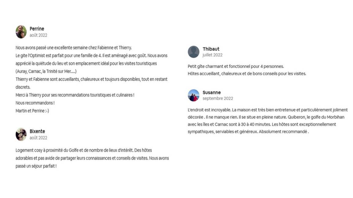 „Nous avons passé un excellent séjour chez Fabienne et Thierry qui été disponibles pour chacune de nos sollicitations, notamment sur les lieux incontournables à explorer dans la région Nous avons vraiment été séduits par le territoire d'Auray. Séjour enrichissant tant sur le plan découvertes géographiques que sur celui des rencontres humaines, Fabienne et Thierry sont des personnes très agréables à côtoyer, nous reviendrons à Pluneret c'est acté!Pour tous ceux qui hésiteraient encore: Allez-y vous ne seraient ravis de l'endroit et de l'accueil des propriétaires !Et enfin pour ne rien oublier, si vous êtes adeptes de sorties cyclotouristes alors là c'est le top: Chaque sortie est une nouvelle découverte Merci pour tout et à très bientôt Christine et Fabien (les gens du Nord...)“