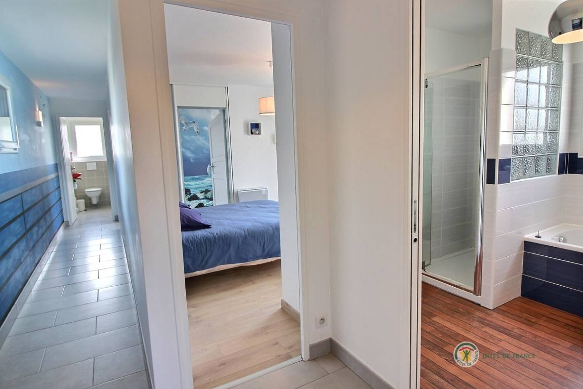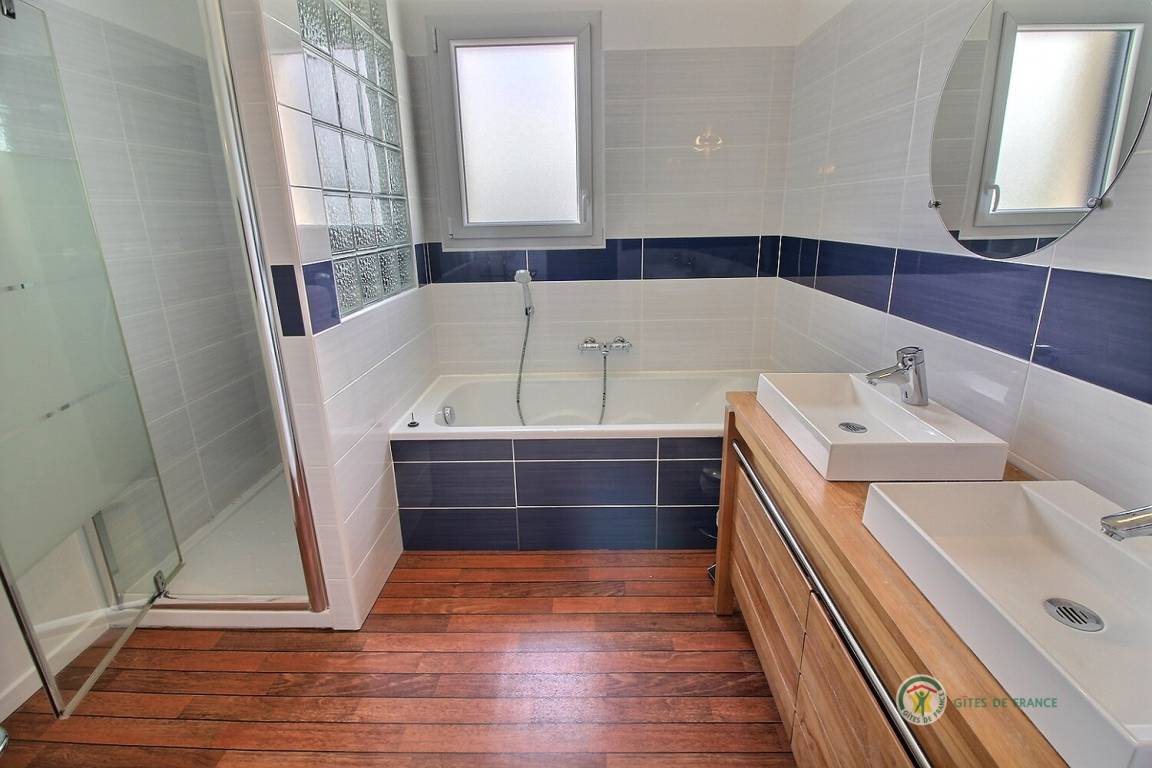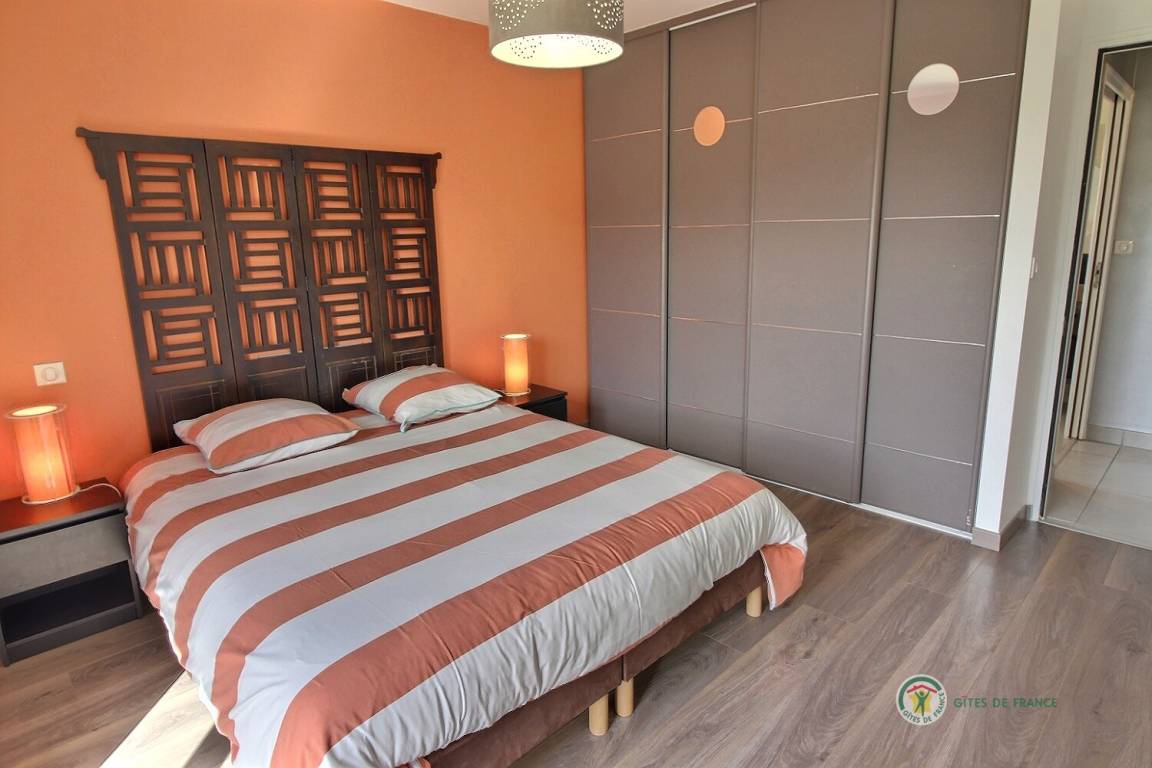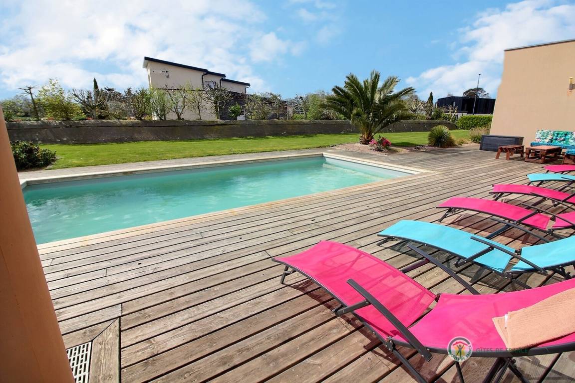 Ihre Ferienwohnung umfasst: eine Eingangshalle, ein Wohnzimmer mit hochwertiger Einbauküche. 2 Schlafzimmer, eines davon für Personen mit eingeschränkter Mobilität zugänglich – (2 160x200 Betten), Badezimmer (ebenerdige Dusche), separates WC mit Waschbecken. Obergeschoss: 3 Schlafzimmer mit Zugang zu einer Balkonterrasse, eines (1 160x200-Bett) mit eigenem Bad (Dusche), 2 Schlafzimmer mit jeweils 2 Einzelbetten (80x200). Schönes Badezimmer (Dusche + Badewanne), separates WC mit Waschbecken. Garage, Terrasse von 125 m². Überdachter beheizter Pool (außer im Winter mit Zuschlag von 40 €/Aufenthalt, außer Juli-August) von 8 x 4 Metern, verfügbar von Ende März bis Mitte November. In einem Schlafzimmer eingerichteter Telearbeitsplatz.