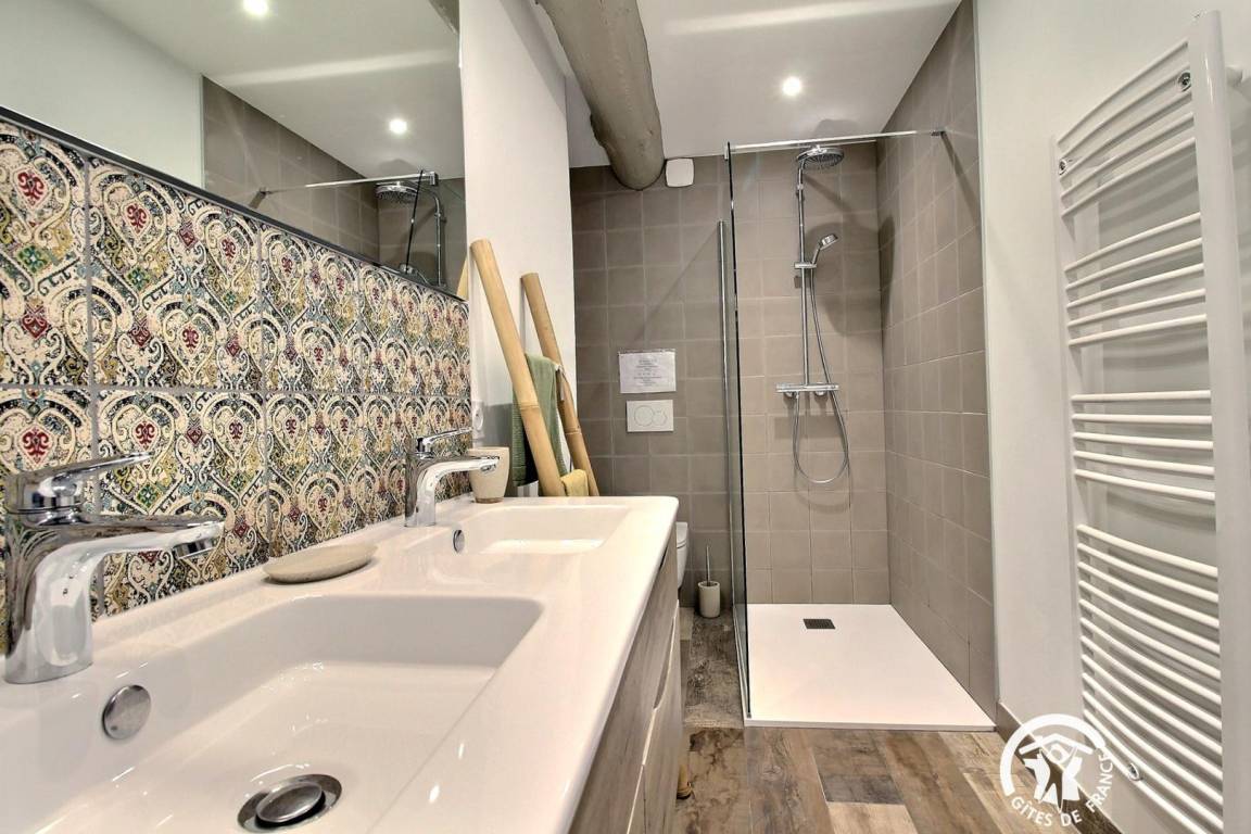- Ein Badezimmer mit ebenerdiger Dusche und zwei Waschbecken.