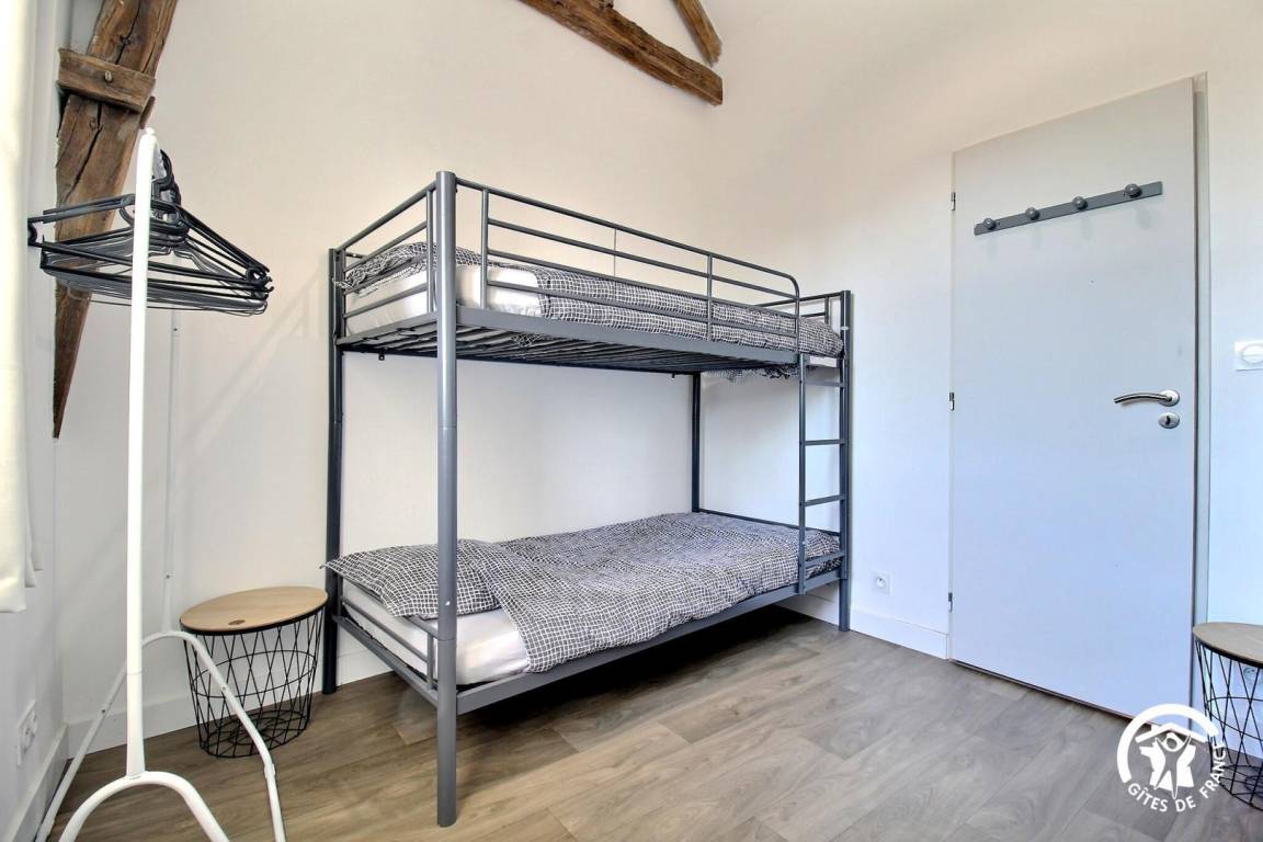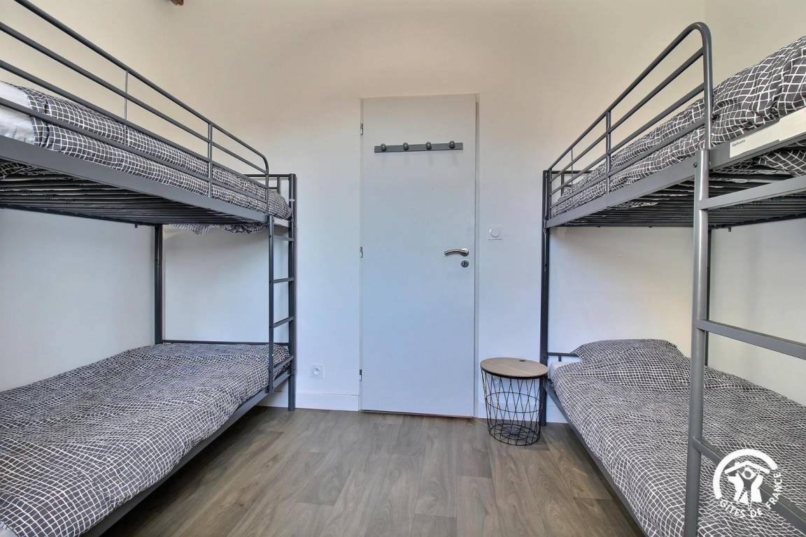 Obergeschoss: 2 Schlafzimmer mit 160 cm breitem Bett, 1 Schlafzimmer für 4 Personen (4 90 cm breite Betten, darunter 2 Etagenbetten) und ein Duschbad mit WC.
