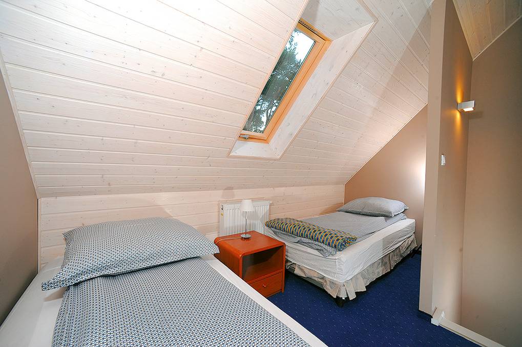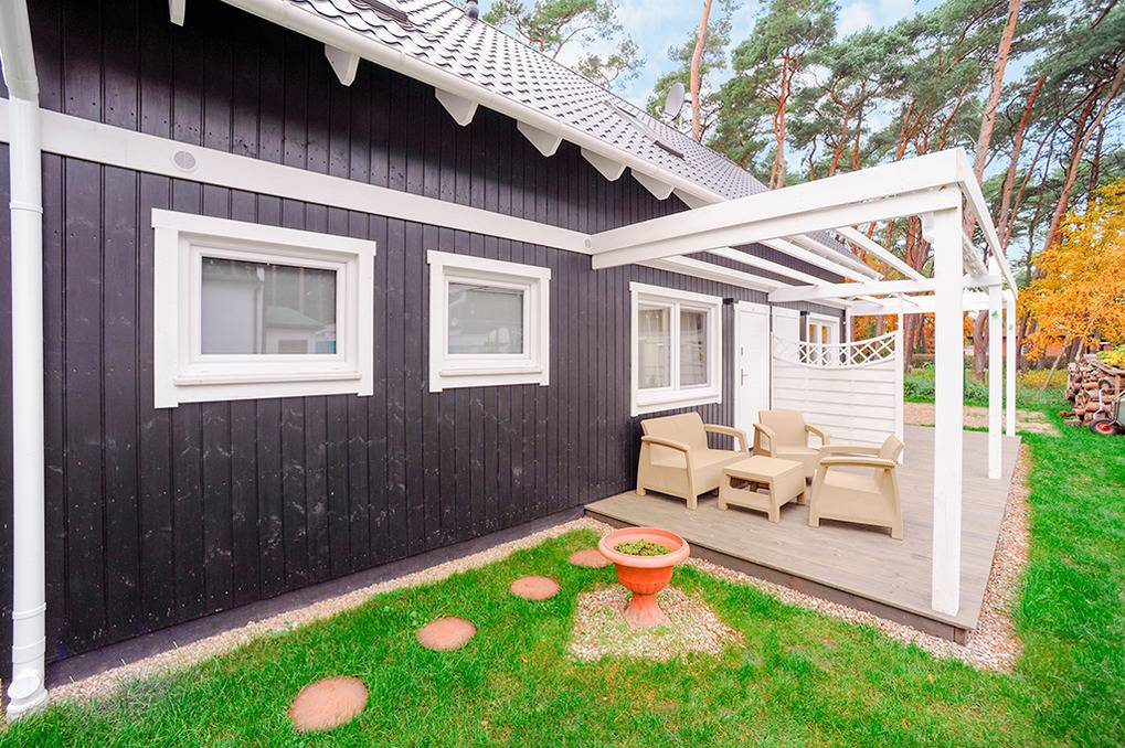 Haus: Ferienhausanlage mit einem freistehenden Ferienhaus und fünf Reihenhäusern im skandinavischen Stil. Freundliche Einrichtung. Zentralheizung. In der Anlage: kleiner Kinderspielplatz. Parkplatz auf umzäuntem Grundstück.
