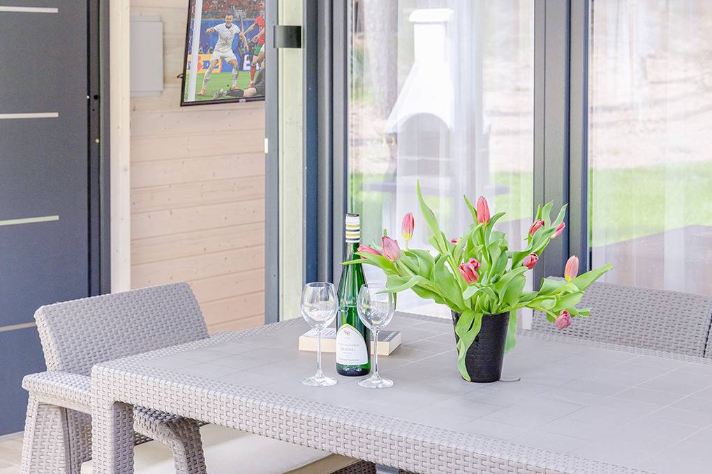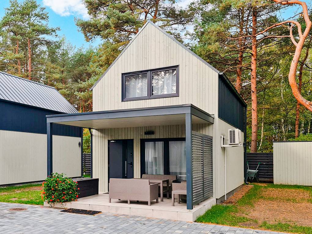 Haus: Schöne, stilvolle Ferienhausanlage, 2022 neu erbaut. Nichtraucherhäuser. Moderne, geschmackvolle Einrichtung. Alle Häuser mit Klimaanlage (Kühl- und Heizfunktion). Kostenloses Internet über W-Lan. Überdachte Terrasse mit Sitzmöbeln, Grill. 2 Pkw-Stellplätze/Haus auf dem abgeschlossenen Grundstück. Zwei Waschmaschinen in der Anlage zur gemeinschaftlichen Nutzung.