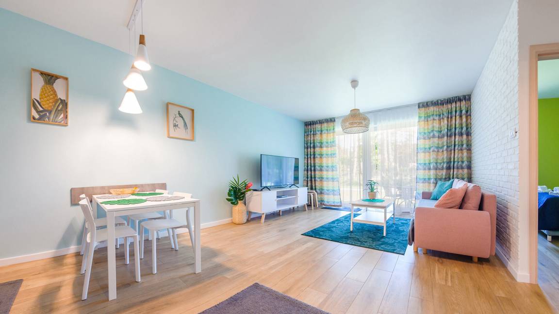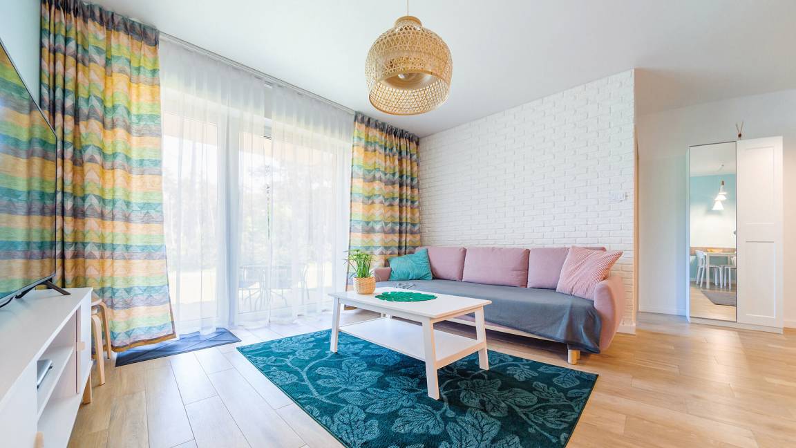 • Haustiere sind in der ausgewählten Wohnung erlaubt. Die Kosten für den Aufenthalt mit einem Haustier betragen 40 PLN pro Tag.