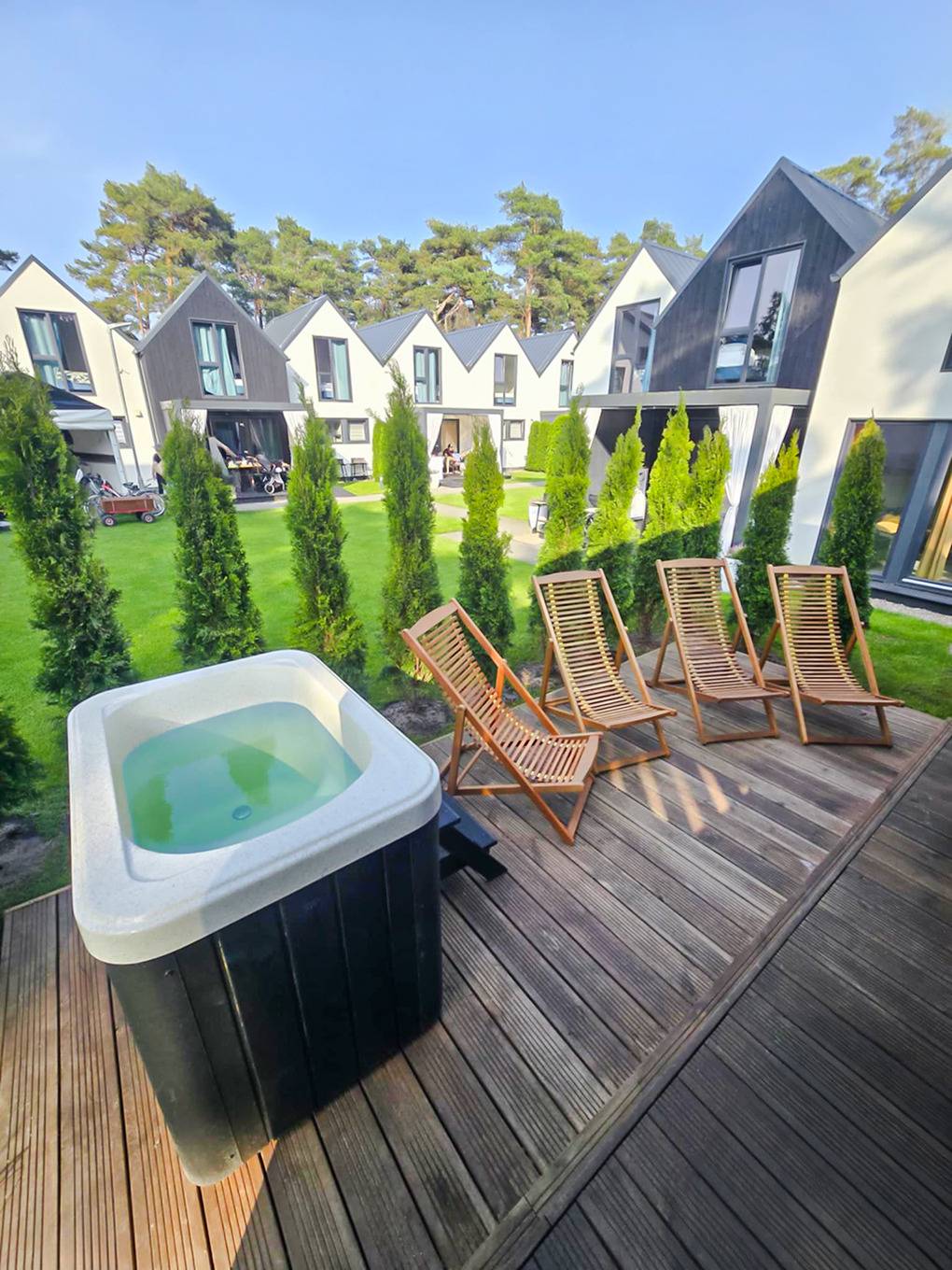 Haus: Gepflegte Ferienhausanlage mit komfortablen Ferienhäusern (Nichtraucherhäuser) auf einem umzäunten Grundstück. Freundliche, wohnliche Einrichtung. 2 Schlafzimmer, eines davon mit Safe und Sat-TV. Kostenloses Internet über W-Lan. Heizung über Klima-Anlage, E-Radiatoren. Terrasse mit Sitzmöbeln, Grill. Spielplatz mit Tischtennis, Kicker, Schaukel, Klettergerüst, Rutsche, Fitnessgeräte, Sauna und Whirlpool zur gemeinschaftlichen Nutzung. 10 Fahrräder vorhanden. 1 Pkw-Stellplatz/Haus auf dem abgeschlossenen Grundstück. Frühstück auf Bestellung vor Ort möglich.