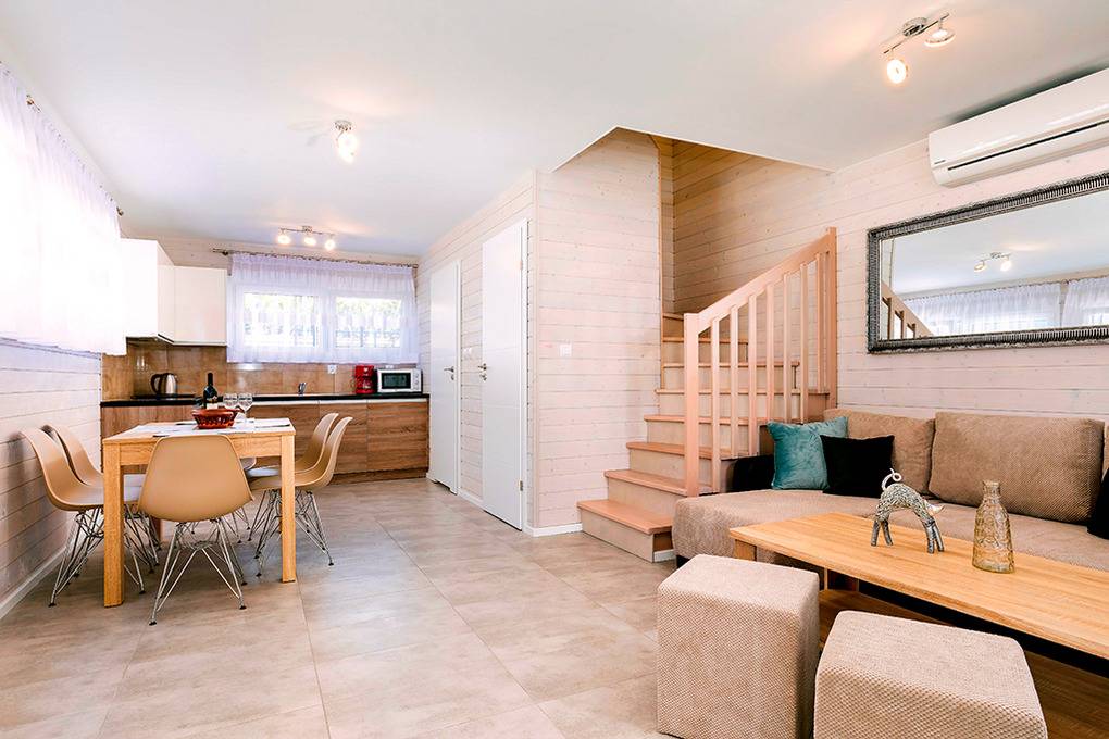 Haus: Schöne Ferienhausanlage. Nichtraucherhäuser. Moderne, geschmackvolle Einrichtung. Alle Häuser mit Klimaanlage (Heizfunktion). Kostenloses Internet über W-Lan. Überdachte Terrasse mit Sitzmöbeln. Grillplatz, kleiner Spielplatz (Schaukel, Rutsche, Sandkasten). 2 Pkw-Stellplätze/Haus auf dem abgeschlossenen Grundstück.