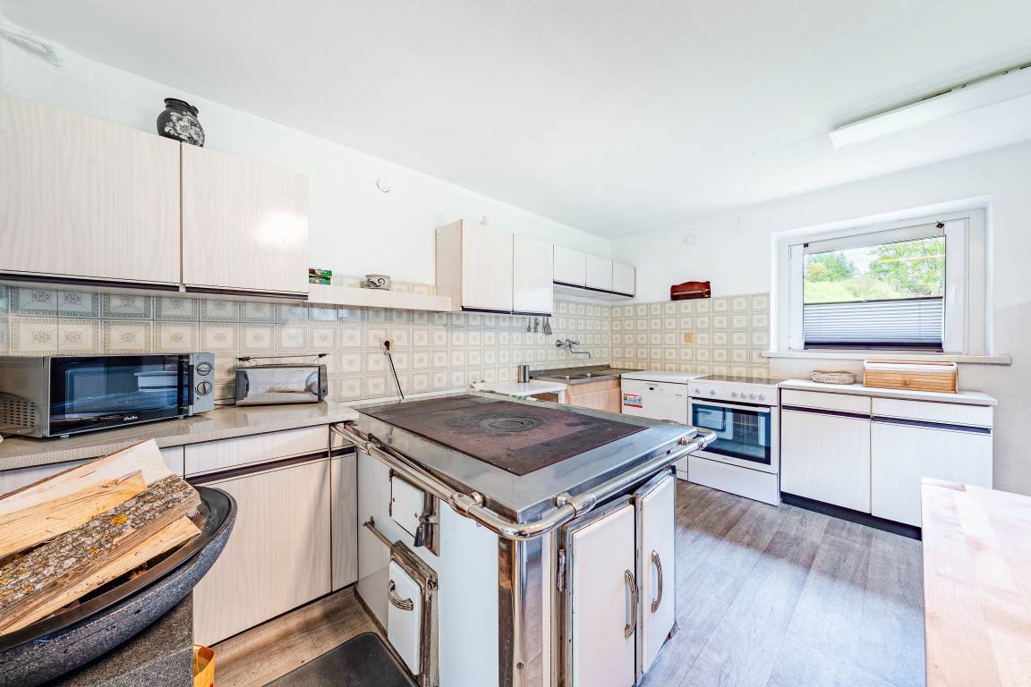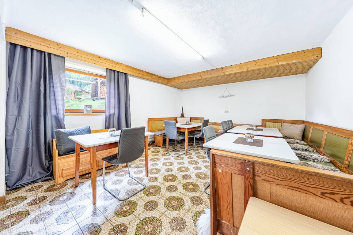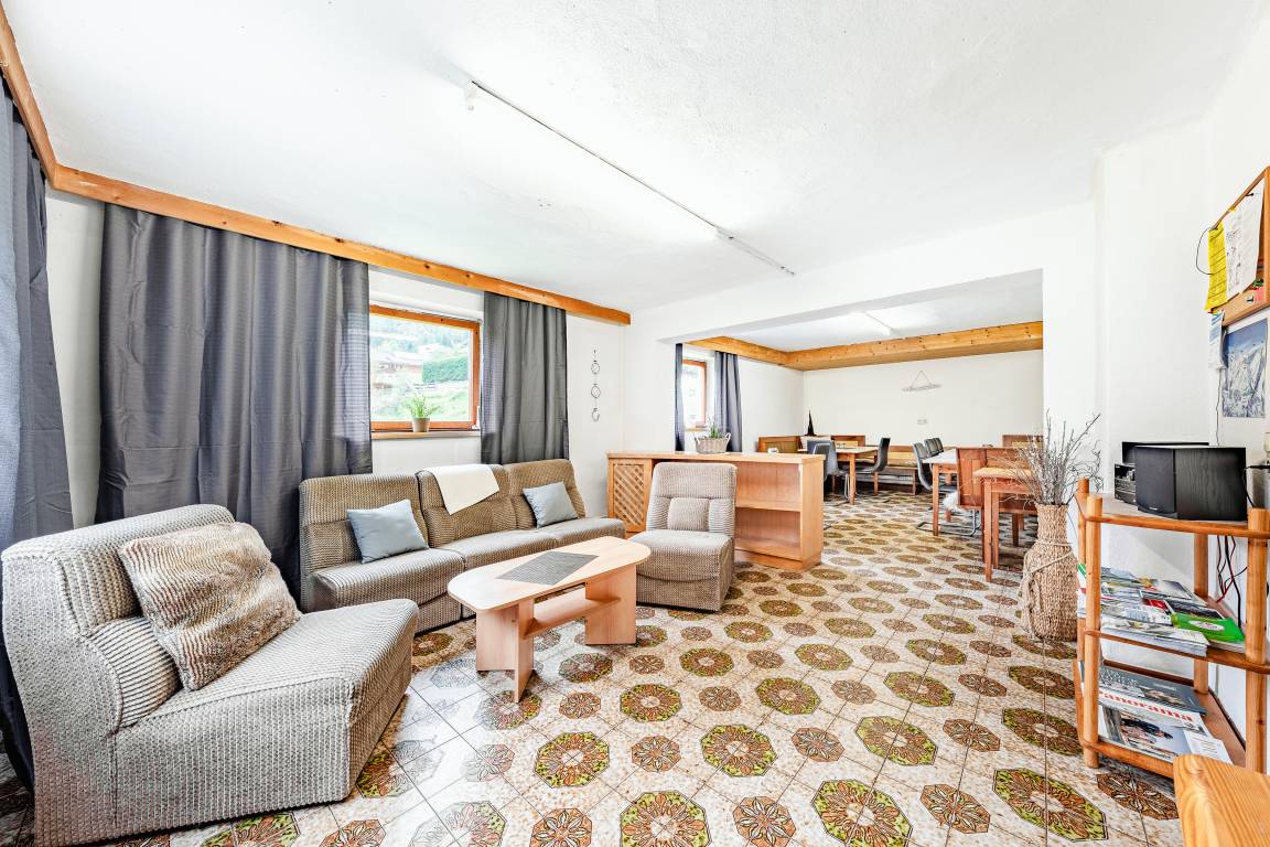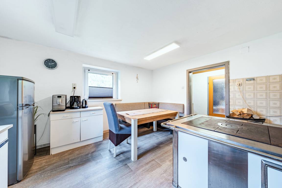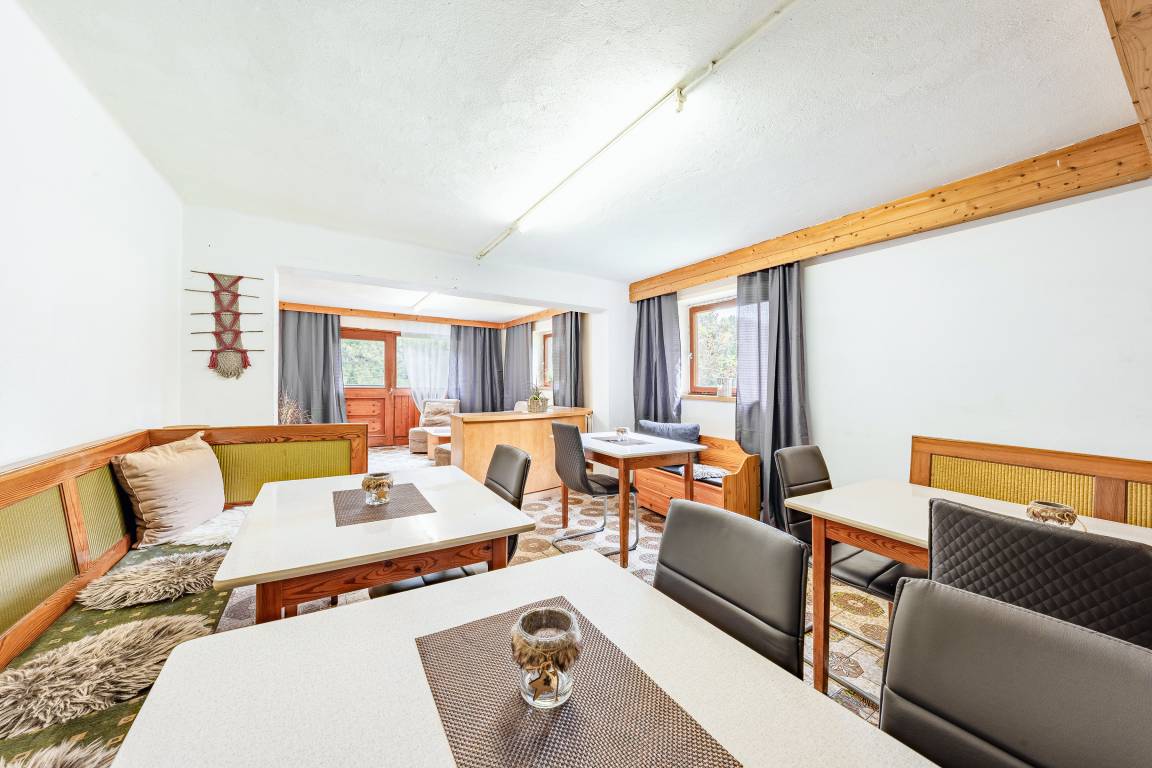 Tiefparterre: Großer Aufenthaltsraum (ca. 40 qm) mit Esstischen, Eckbänken, Couchgarnitur, Sat-TV. Funktionelle Bauernküche mit Backofen, Spülmaschine, Mikrowelle, zusätzlichem Holzherd. Separates WC. Terrasse.