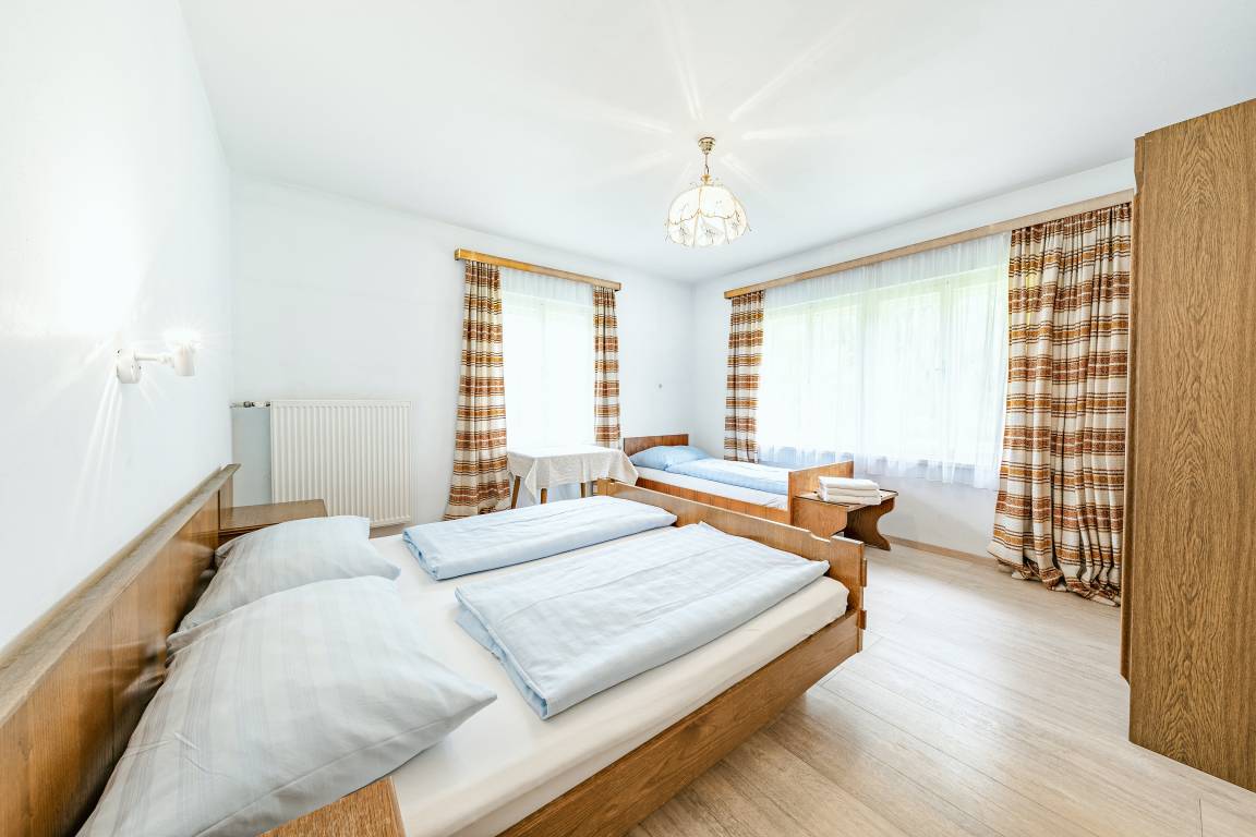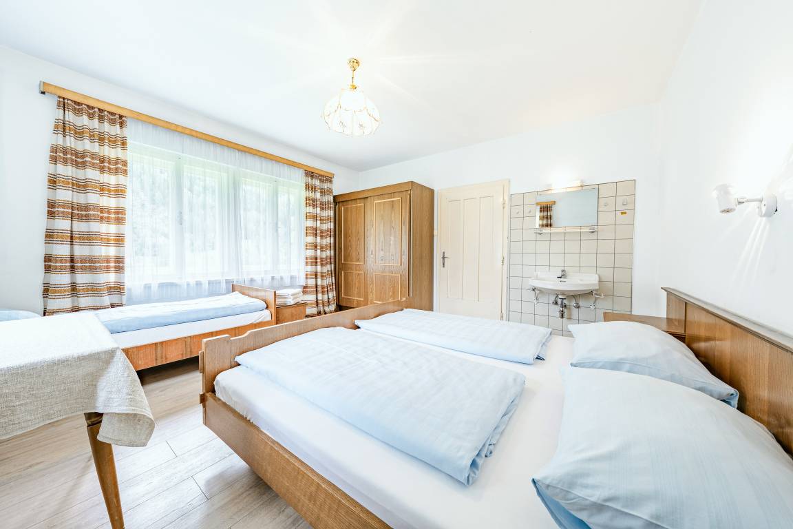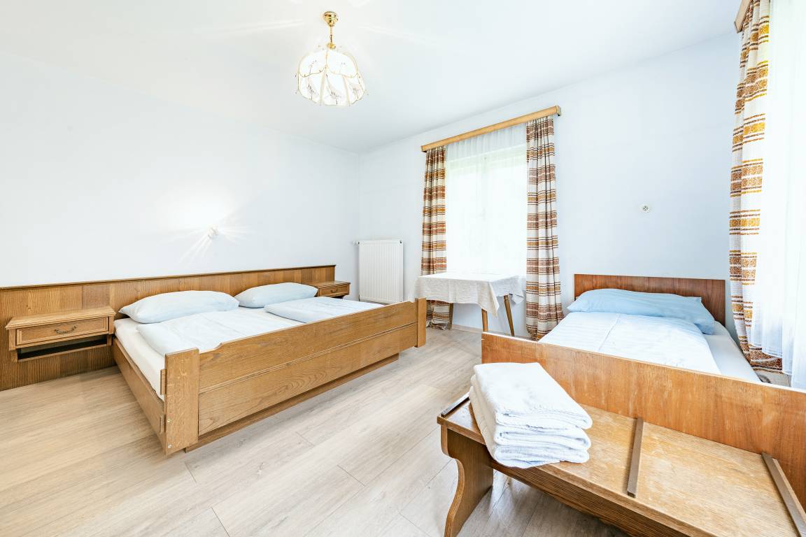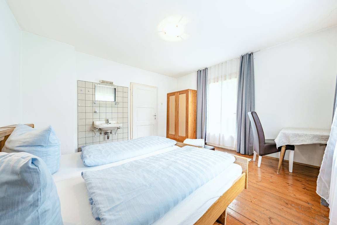 1. Etage: 4 Doppelzimmer. 3-Bettzimmer mit Doppelbett, Ausziehcouch (1 Pers.). Waschraum: 2 Du, Wb.