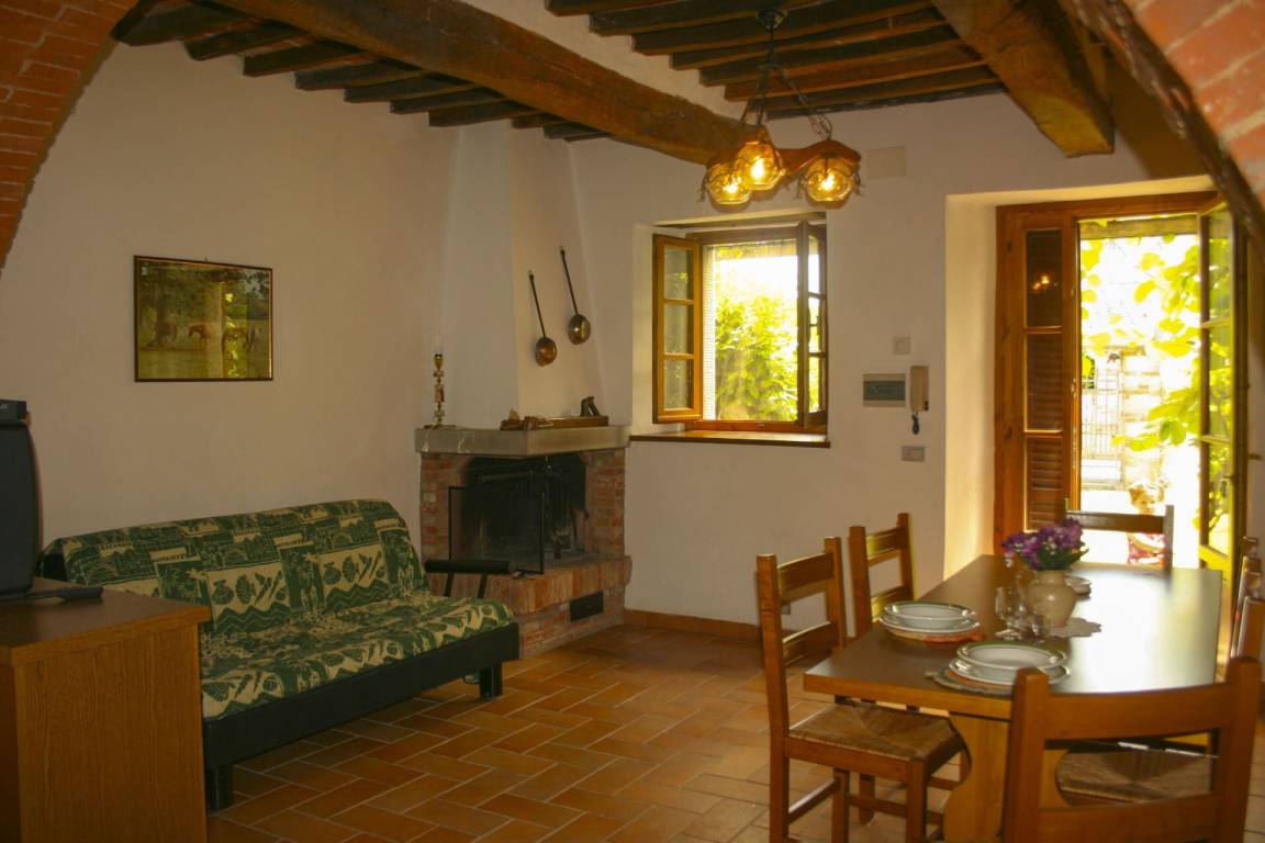 Wohnung im Erdgeschoß bestehend aus: Wohn-/Eßzimmer mit Kochnische, Kamin und Doppel-Bettcouch, Doppelzimmer, Bad mit Dusche.