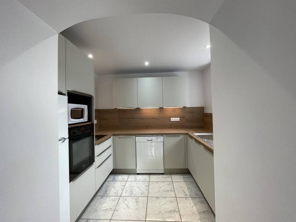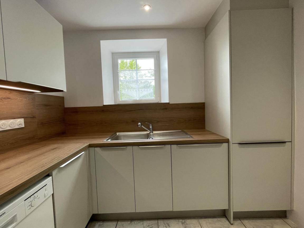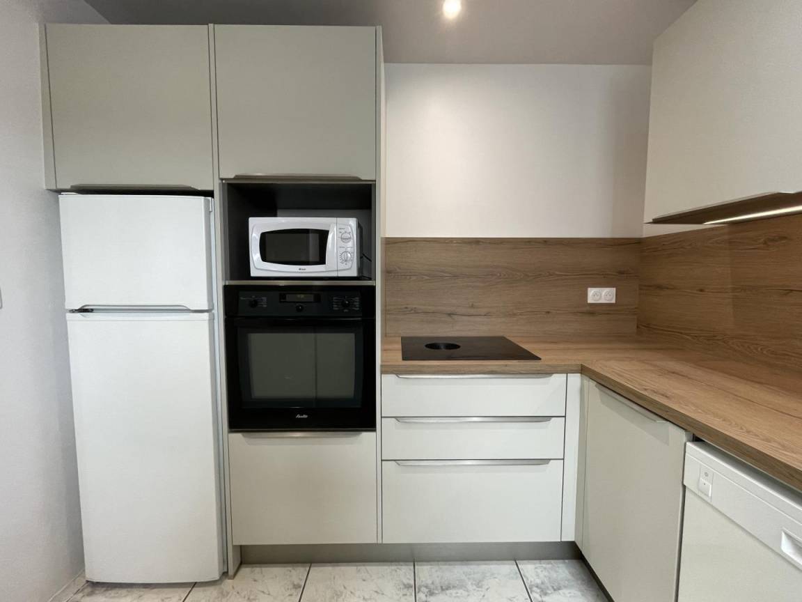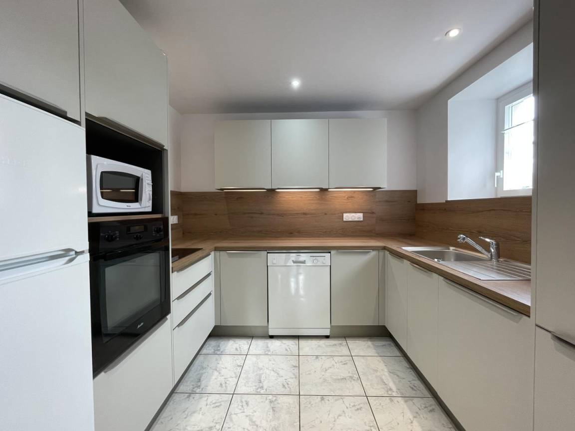 Erdgeschoss: Kochnische (Mikrowelle, Waschtrockner, Geschirrspüler, Backofen, 4-Platten-Induktionskochfeld, Kühl-/Gefrierkombination).