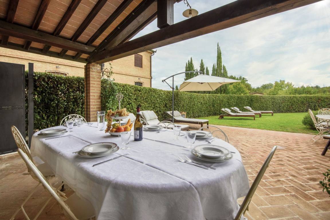 Garten: Schwimmbad (privat, Breite: 4m, Länge: 8m, Außen), Grill, Außenbereich für das Essen im Freien, Esstisch (Personen: 8), Gartenmöbel, acht Sonnenliegen, eingezäunt.