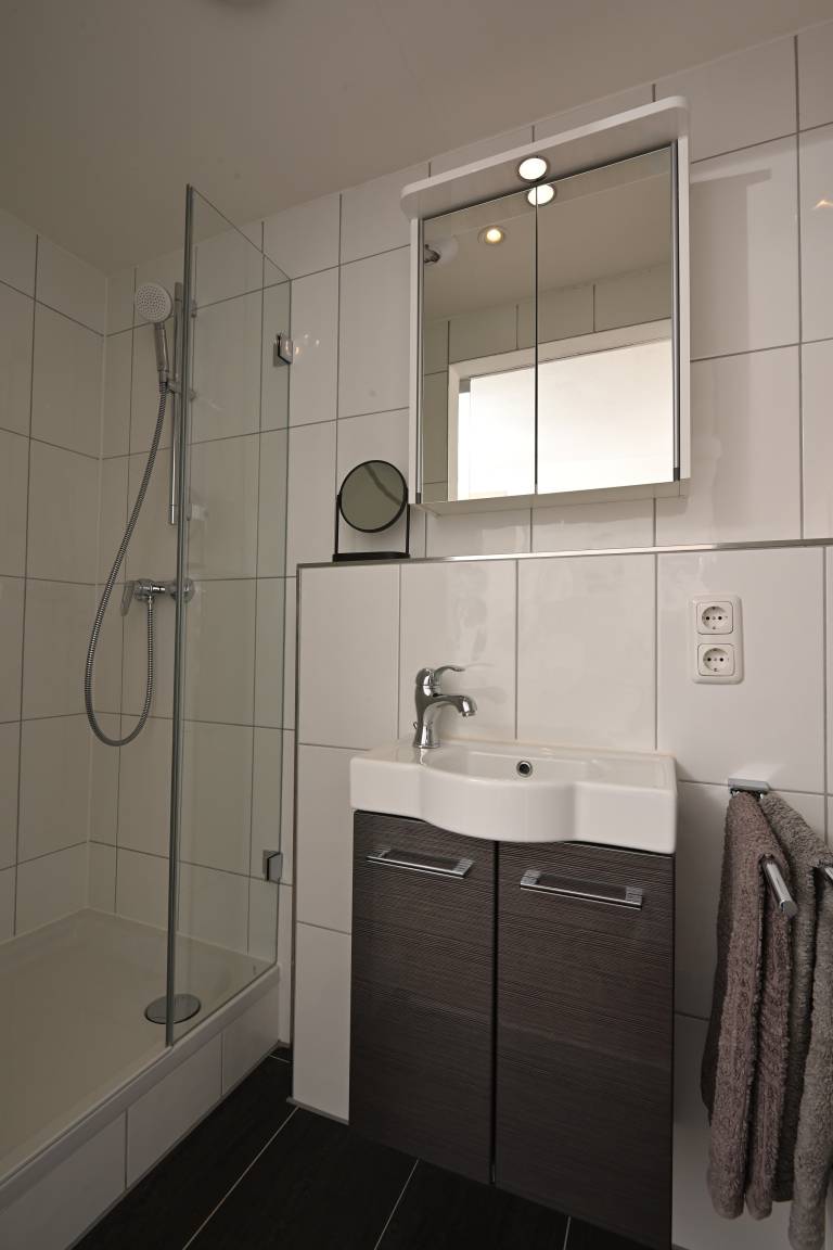Die Wohnung ist durch die Größe ideal um am Abend oder bei schlechtem Wetter eine schöne Zeit mit Freunden und Familie zu verbringen, gemeinsam an der Kochinsel zu kochen, am großen Eßtisch Spiele zu spielen, sich dann aber auch mal zurück zu ziehen um gemütlich den Lieblingsfilm im Bett zu schauen. Neben dem Fernseher im Wohnraum befindet sich in jedem Schlafzimmer ein Fernseher, insgesamt sind es 3 Fernseher. Das Programm läuft über Waipu. WLAN ist natürlich vorhanden. Die Wohnung hat 2 Duschbäder, eins davon ist ein kleines Bad en Suite in dem kleineren Schlafzimmer, das andere Bad liegt angrenzend am großen Wohnraum und hat eine großzügige Größe. Beide Schlafzimmer haben ein Doppelbett - einmal 180er Breite und einmal 160er Breite. Angrenzend am Eingangsbereich befindet sich eine große Diele für Ihre Schuhe und Kleidung und Unterbringung der Koffer. Zwischen den 2 Schlafzimmern befindet sich eine kleine Teeküche mit Spüle, und Mikrowelle. In der großen Küche gibt es von Tchibo einen Kaffeevollautomat.