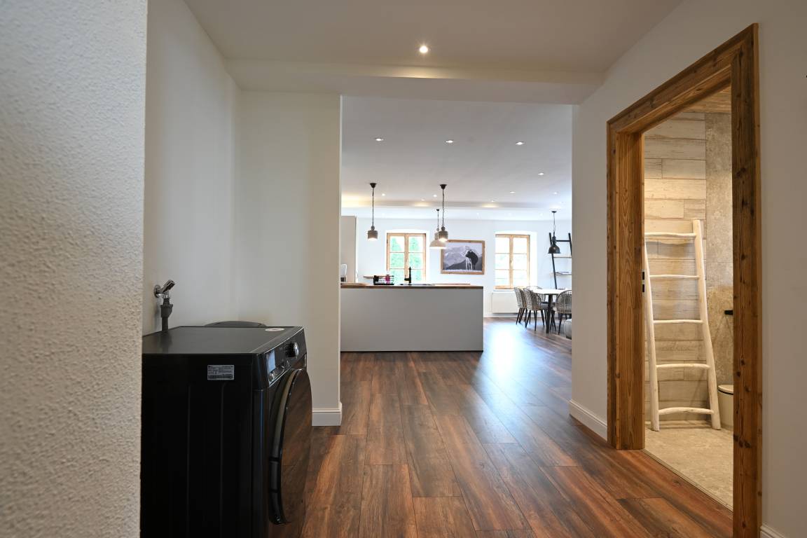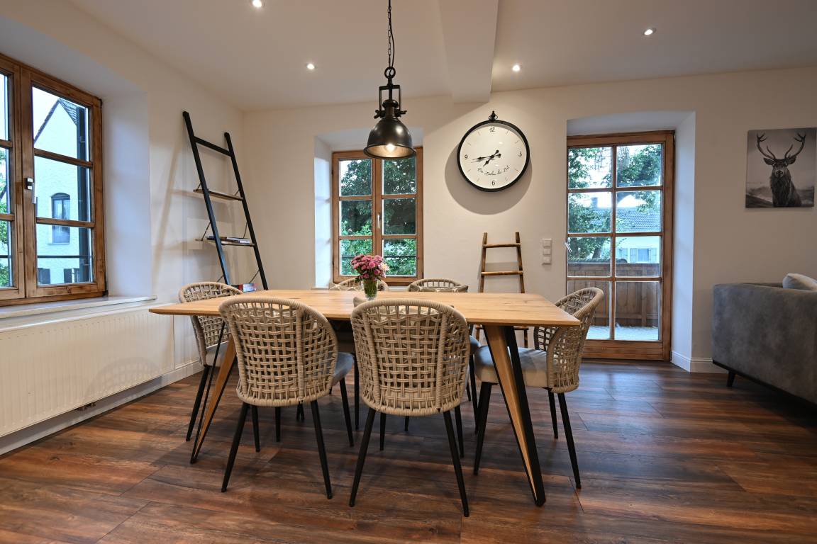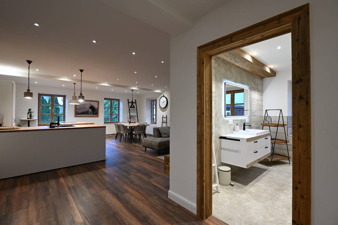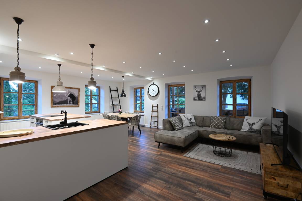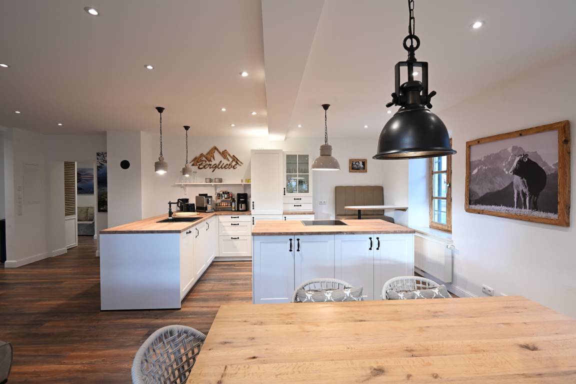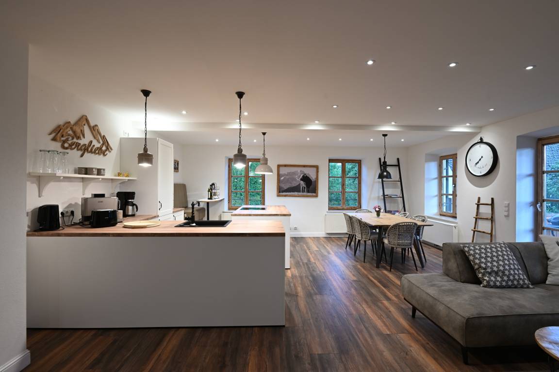 Durch großzügig viele Deckenstrahler, die separat gedimmt werden können, kann sich hier jeder Gast sein individuelles Wohlfühllicht einstellen, egal ob am Abend oder an Tagen mit schlechten Wetter- und Lichtverhältnissen, in dieser wunderschönen Wohnung hat man es immer gemütlich hell, so wie man es haben möchte.