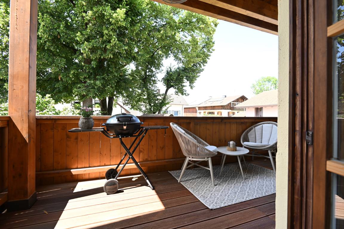 Der großzügige Balkon ist überdacht und hat 2 Aussenlampen und im Sommer einen Elektrogrill.