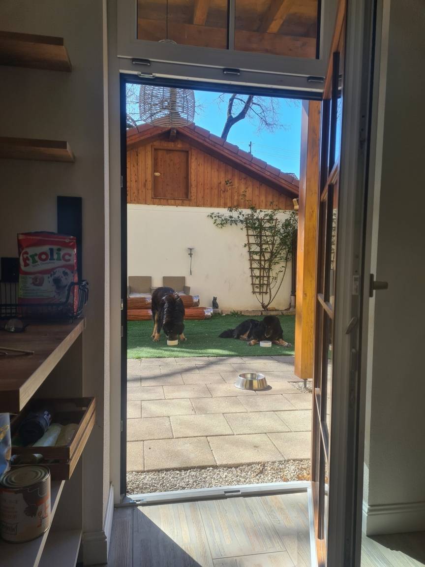 Die Terrasse ist überdacht und beleuchtet und hat einen Elektrogrill für die Sommertage. Der Garten ist rundherum 160 cm hoch eingezäunt, bietet zu 90% Sichtschutz - er ist das Highlight für die Gäste mit Hund denn hier sind auch 2 Hunde herzlich willkommen. Für Hunde und Kinder steht im Sommer ein Kinderplanschbecken oder Hundepool bereit. Der Rasen ist Kunstrasen - Naturrasen hat sich leider nicht gehalten auf der beanspruchten Fläche, aber gerade für die Sommerzeit und die Planschbeckenzeit, aber auch für den Winter ist es ideal da so kaum Dreck in die Wohnung getragen wird.