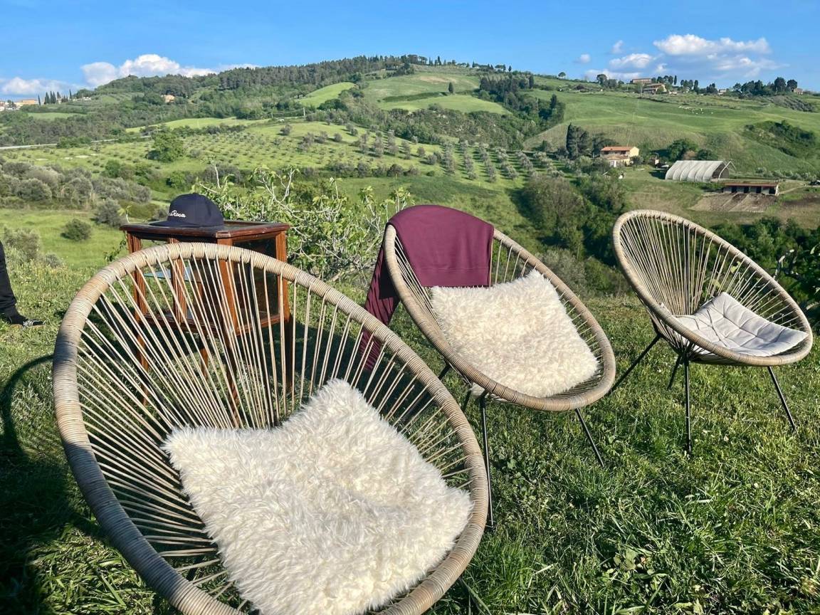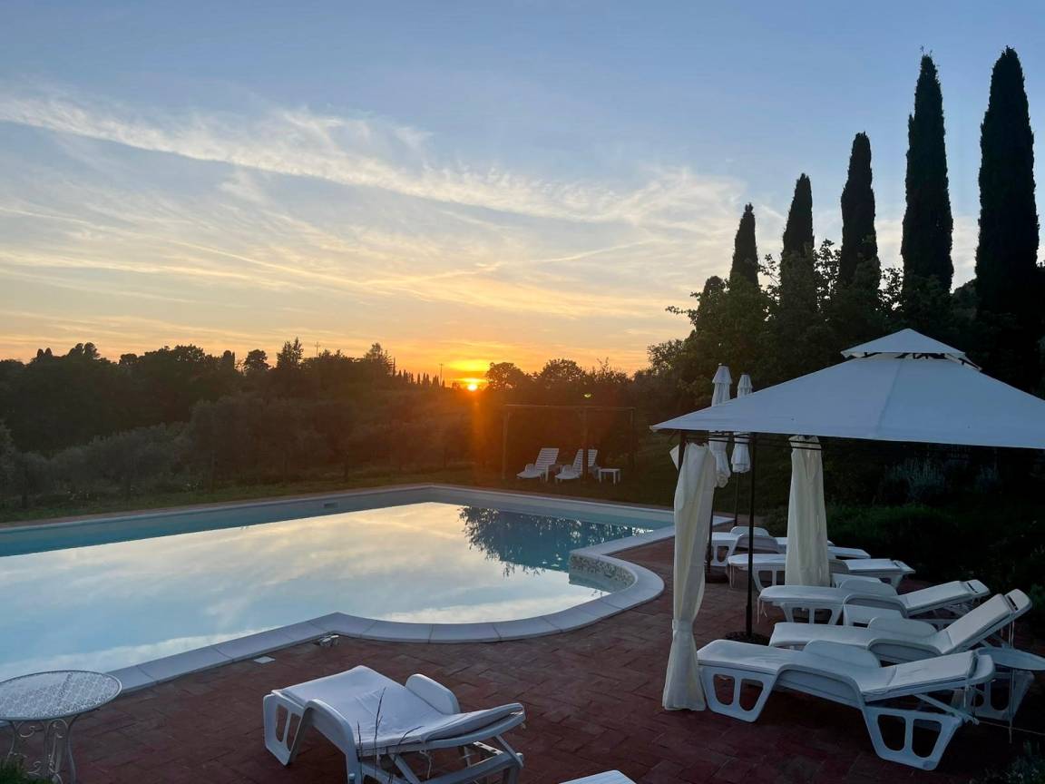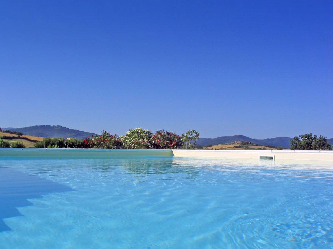 Lassen Sie die Seele baumeln in unserem 15x8 Meter großen, sonnigen und je nach Jahreszeit beheizten* Panoramapool, mit römischer Treppe und geniessen Sie dort oder in den Sonnenliegen den Ausblick auf die traumhafte Hügellandschaft des faszinierenden Val di Cecina.