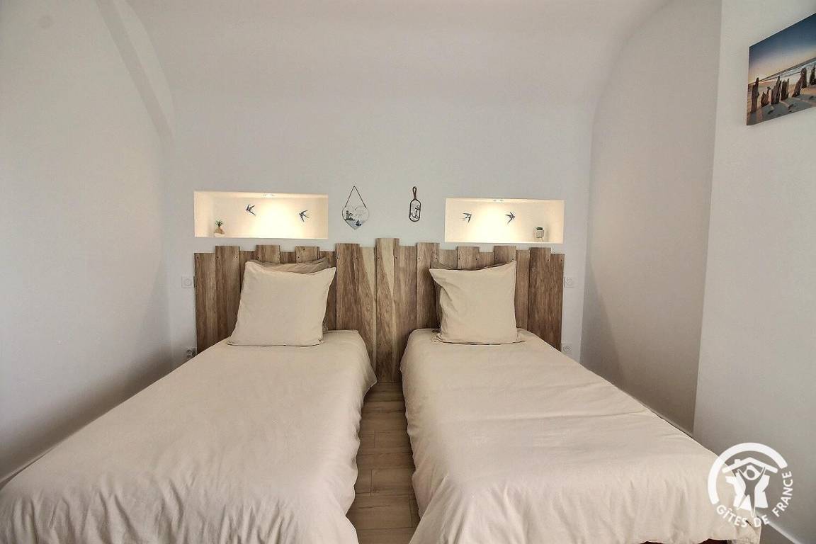 - ein Schlafzimmer links mit zwei Einzelbetten (90 x 190 cm), die auf Anfrage zusammengestellt werden können,