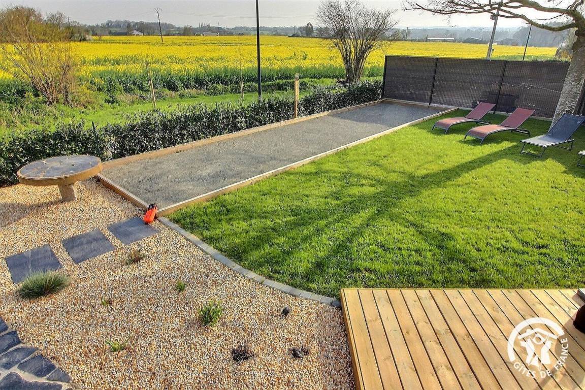 – ein 300 m² großer, umzäunter Garten mit einer 30 m² großen, nach Süden ausgerichteten Holzterrasse, Rasenfläche, angelegten Blumenbeeten und einer Boulebahn,