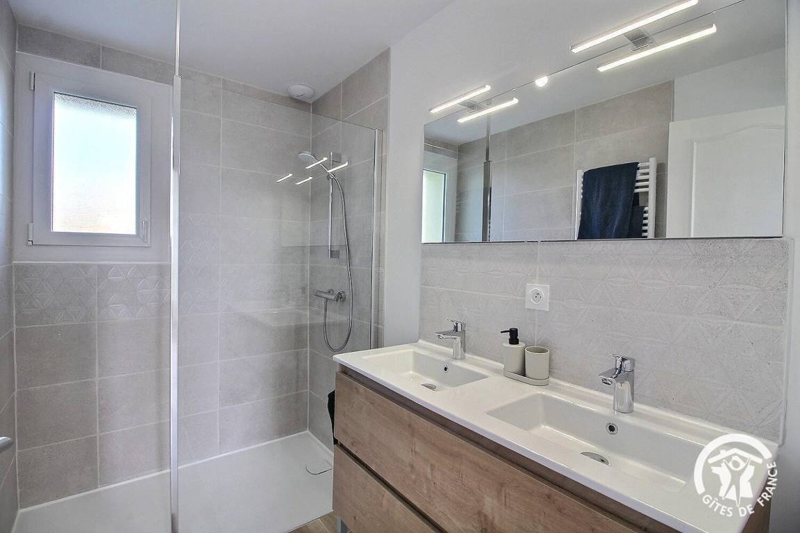 - ein Duschbad mit ebenerdiger Dusche und Doppelwaschbecken,
