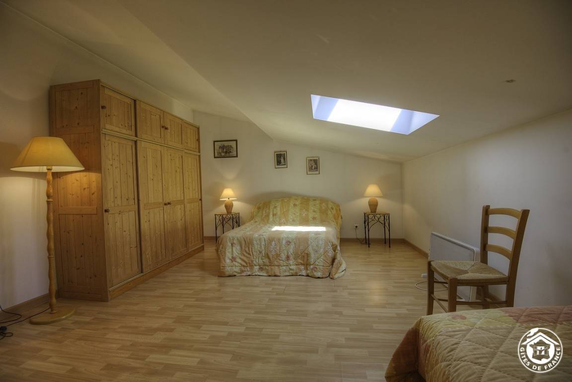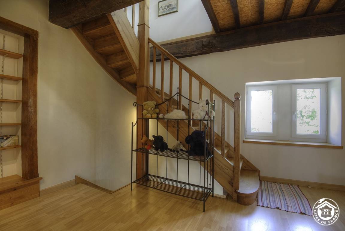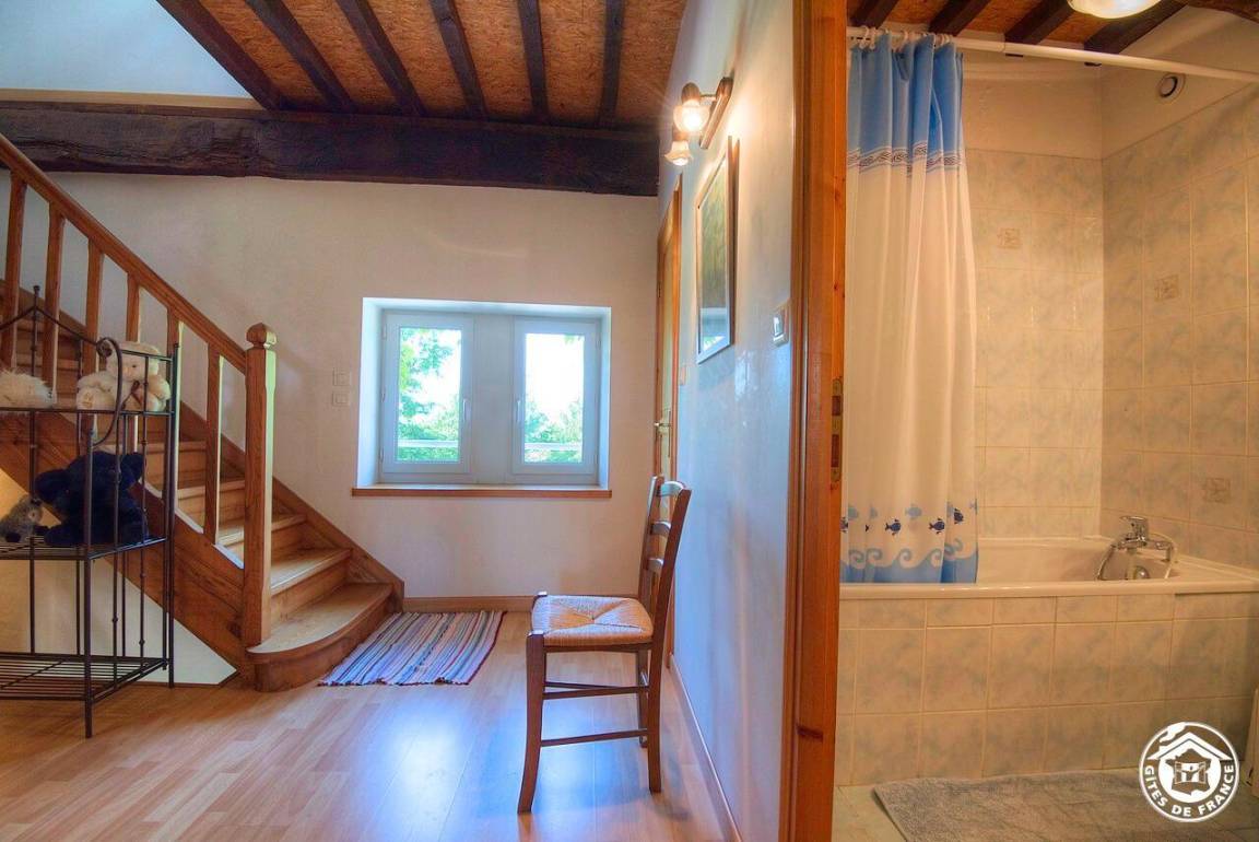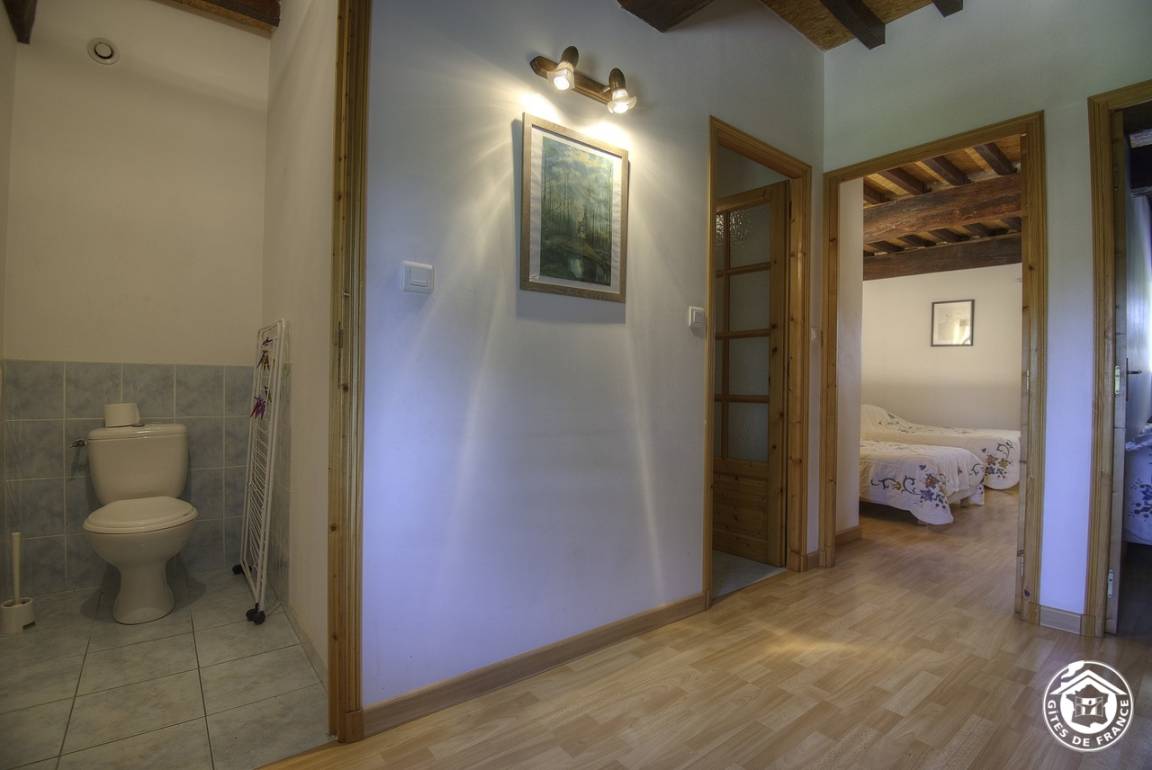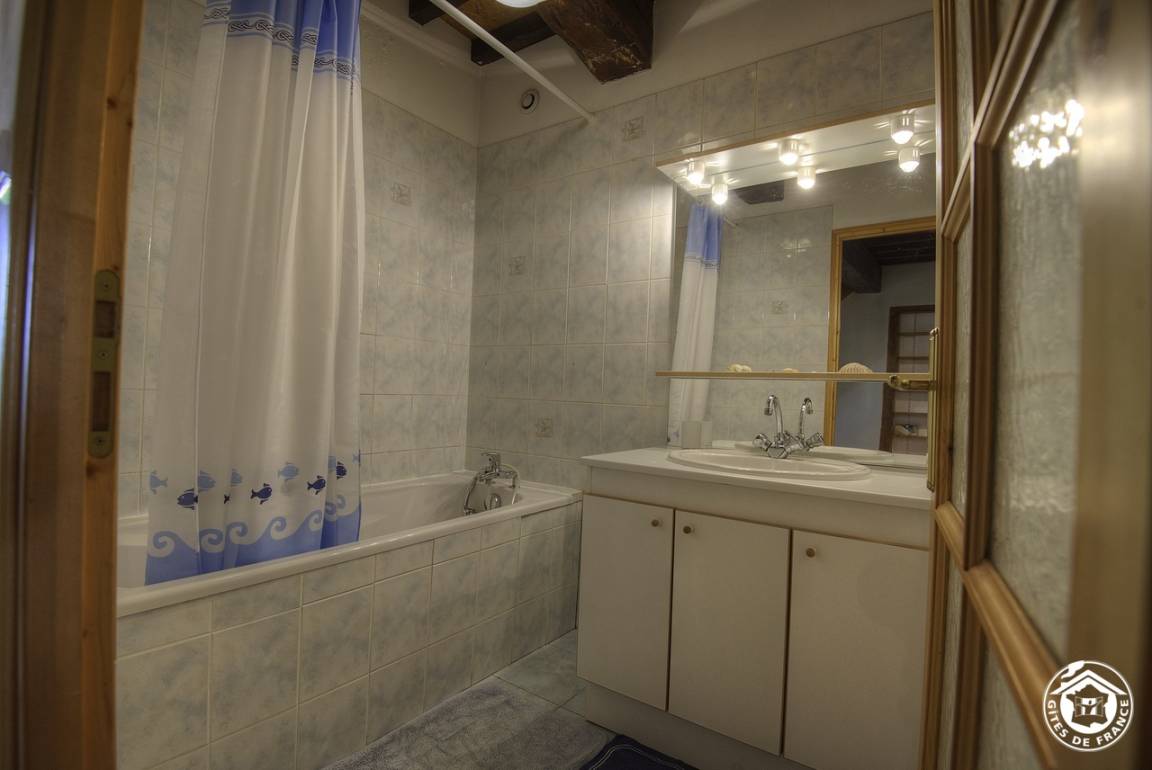 Im ersten Stock bietet ein Treppenabsatz Zugang zum Badezimmer, einer separaten Toilette und zwei Schlafzimmern (zwei Einzelbetten und zwei Einzelbetten). Im 2. Stock befinden sich ein großes Schlafzimmer im Dachgeschoss (1 Doppelbett + 1 Einzelbett 80 cm) und ein Duschraum mit Wasch