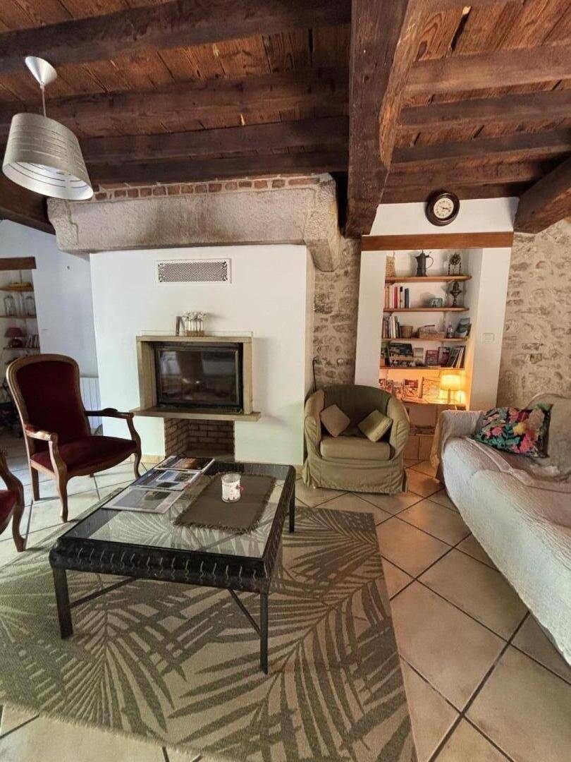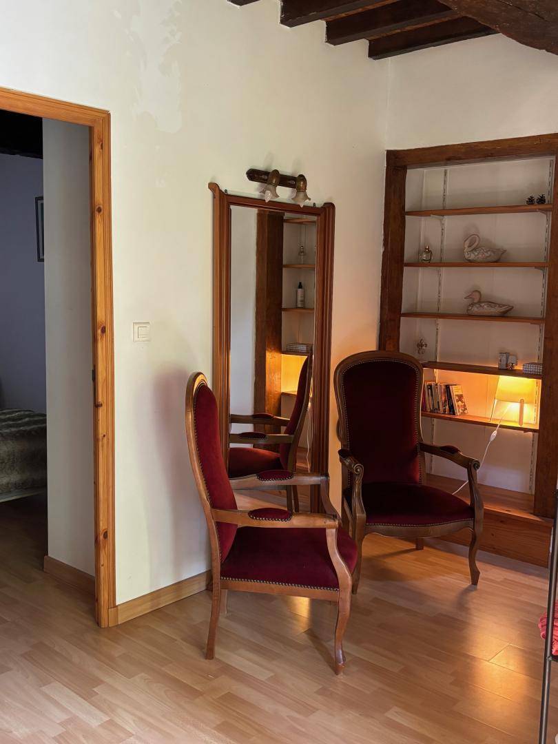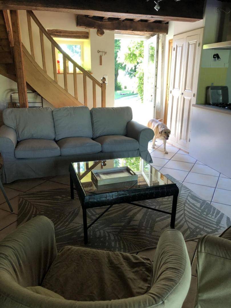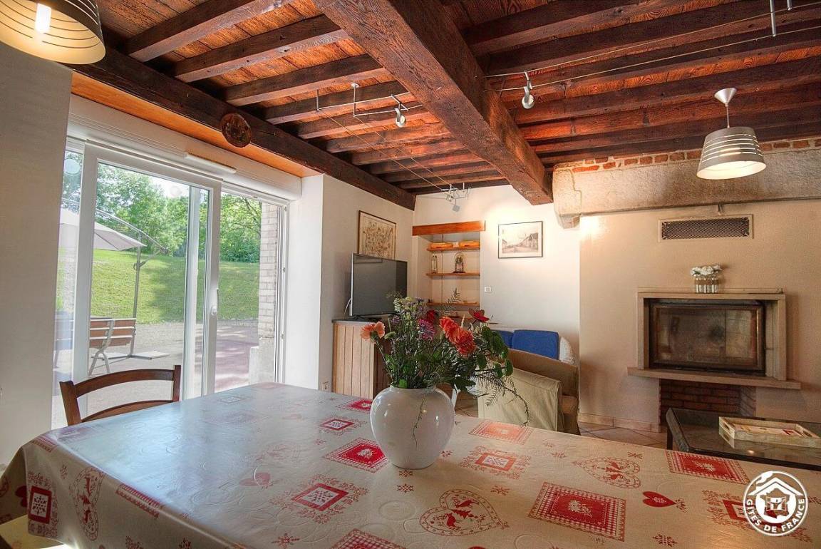 Im Erdgeschoss führt der Eingang direkt in das Wohnzimmer mit offener Küche und Wohnzimmer. Wenn Sie möchten, können Sie an Winterabenden den Kamin genießen (ein Korb mit Holz wird bereitgestellt). Ein großer Bressane-Tisch lädt zu Ihren Mahlzeiten ein. Im Eingang befindet sich eine separate Toilette. Durch das große Erkerfenster haben Sie direkten Zugang zur Terrasse der Gîte mit Gartenmöbeln, einem Grill und Liegestühlen, die nicht einsehbar ist.
