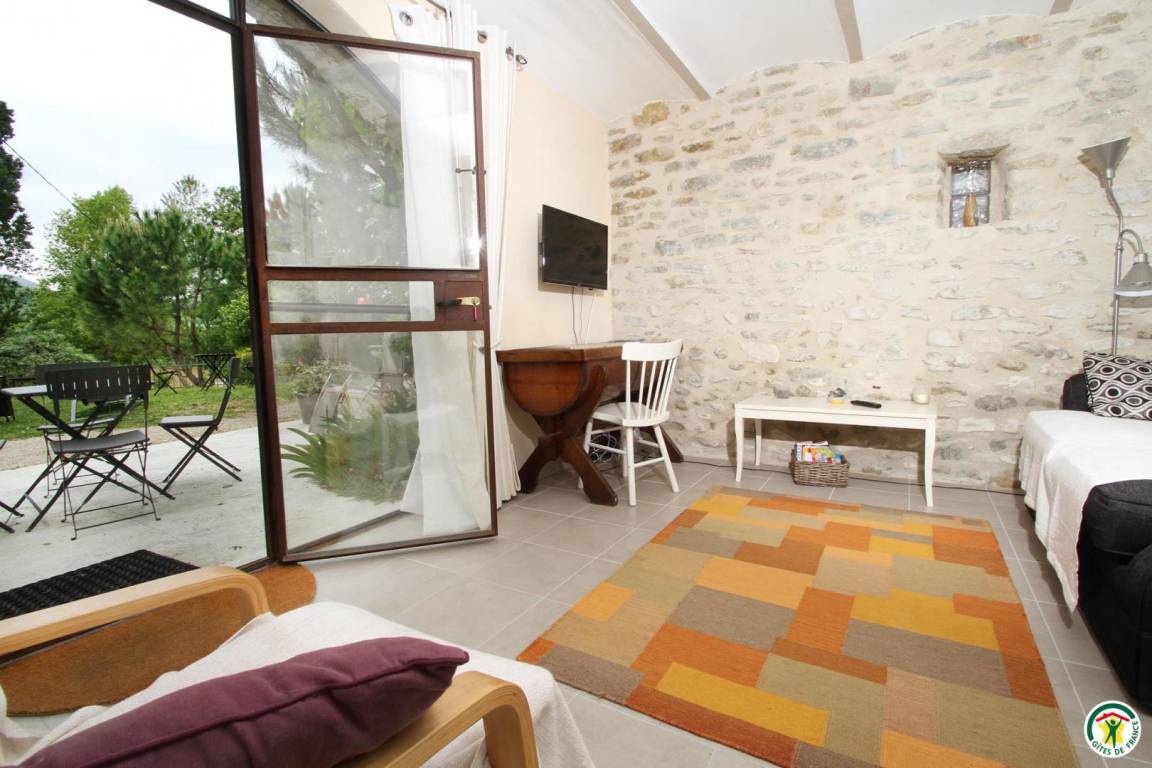 "Wohnzimmer, Esszimmer mit komplett ausgestatteter Küchenzeile. 1 Schlafzimmer (1 Bett 160 x 200 cm), Bad (Dusche) mit WC. Die Betten sind bei Ihrer Ankunft hergerichtet, Handtücher inklusive. Die Ferienunterkunft "Ezahut" befindet sich auf dem Anwesen "Les Beaux Chênes", das insgesamt 3 Ferienunterkünfte für 2 bis 4 Personen und das Haus der Vermieter beherbergt."