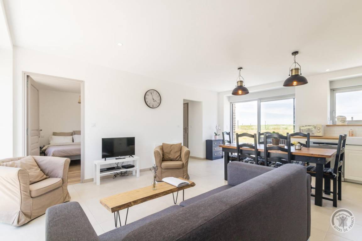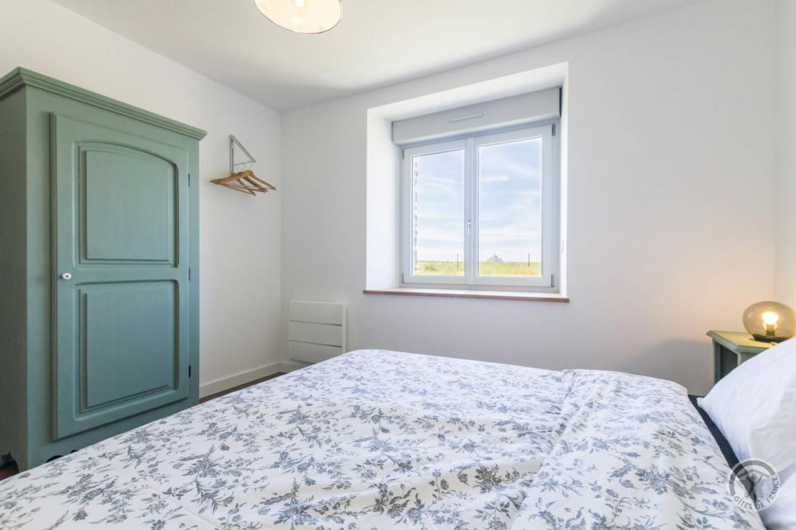Einfamilienhaus im Erdgeschoss. Küche (Filterkaffeemaschine, Backofen, Geschirrspüler, Cerankochfeld, Kühlschrank mit Gefrierfach, Mikrowelle) offen zum Wohnzimmer (TV, Internet). Waschraum mit WC (Waschmaschine). Schlafzimmer 1 (Bett 160x200) mit eigenem Bad. Eine Treppe führt zu Schlafzimmer 2 (2 Betten 90x190), Schlafzimmer 3 (Bett 160x200) und das Badezimmer mit Dusche. Bettwäsche, Handtücher und Bettwäsche werden zur Verfügung gestellt. Wireless Internet.Angrenzend an eine große Scheune.Terrasse, Gartenmöbel.Picknicktisch.Barbecue.Pétanque-Platz.Tischtennis.Parking. Grill, privater geschlossener Garten, Schlüsselbox für Ankünfte nach 18:00 Uhr. Das Ferienhaus ist nicht barrierefrei. Blick auf den Mont Saint-Michel je nach Jahreszeit und Kultur des benachbarten Feldes.